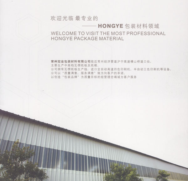 常州宏業(yè)包裝材料有限公司從最初的鮮為人知發(fā)展到現(xiàn)今包裝材料行業(yè)的主流品牌之一。公司生產(chǎn)的包裝材料產(chǎn)品不僅在國內(nèi)已經(jīng)建立了大量的穩(wěn)定的客戶,產(chǎn)品也已遠(yuǎn)銷到國外多個國家和地區(qū),深受客戶的好評。 公司臨近常州經(jīng)濟(jì)要道滬寧高速橫山道口處,主要生產(chǎn)中高檔瓦楞紙板及紙箱,公司擁有瓦楞紙板生產(chǎn)線、進(jìn)口全自動高速四色印刷機(jī)、半自動三色印刷機(jī)等設(shè)備,公司以“質(zhì)量滿意,服務(wù)滿意”做為向客戶的承諾,以創(chuàng)造“包裝品牌”為質(zhì)量目標(biāo)的經(jīng)營理念竭誠為客戶服務(wù)。 公司已通過ISO9001和1400的認(rèn)證。 宏業(yè)包裝的商業(yè)信條:宏業(yè)相信自己會成功, 宏業(yè)相信自己所銷售的商品 ,宏業(yè)員工相信自己所在的公司 ,宏業(yè)相信自己的員工和客戶,宏業(yè)相信成功并不是賺取金錢,而是創(chuàng)造信譽,只有好的信譽,成功才會有價值,宏業(yè)相信世界上最美好最偉大的詞就是“自信”,宏業(yè)相信自已每做一次銷售,就交上一個朋友。