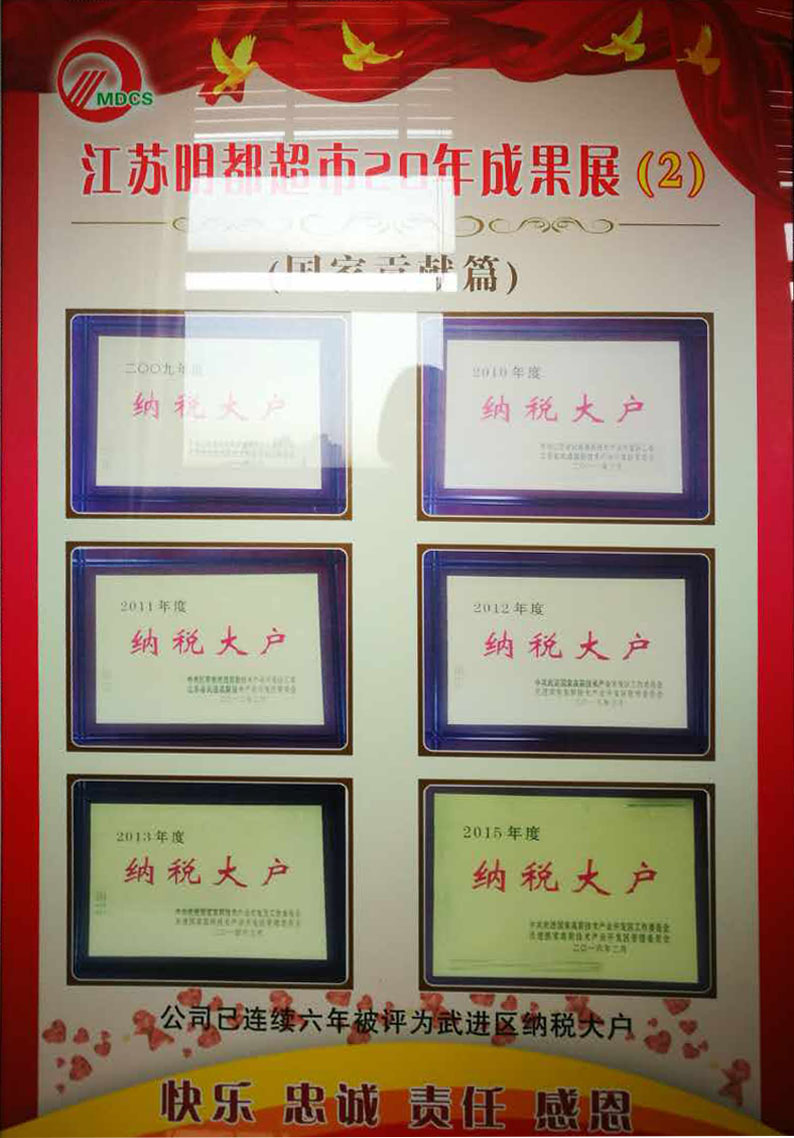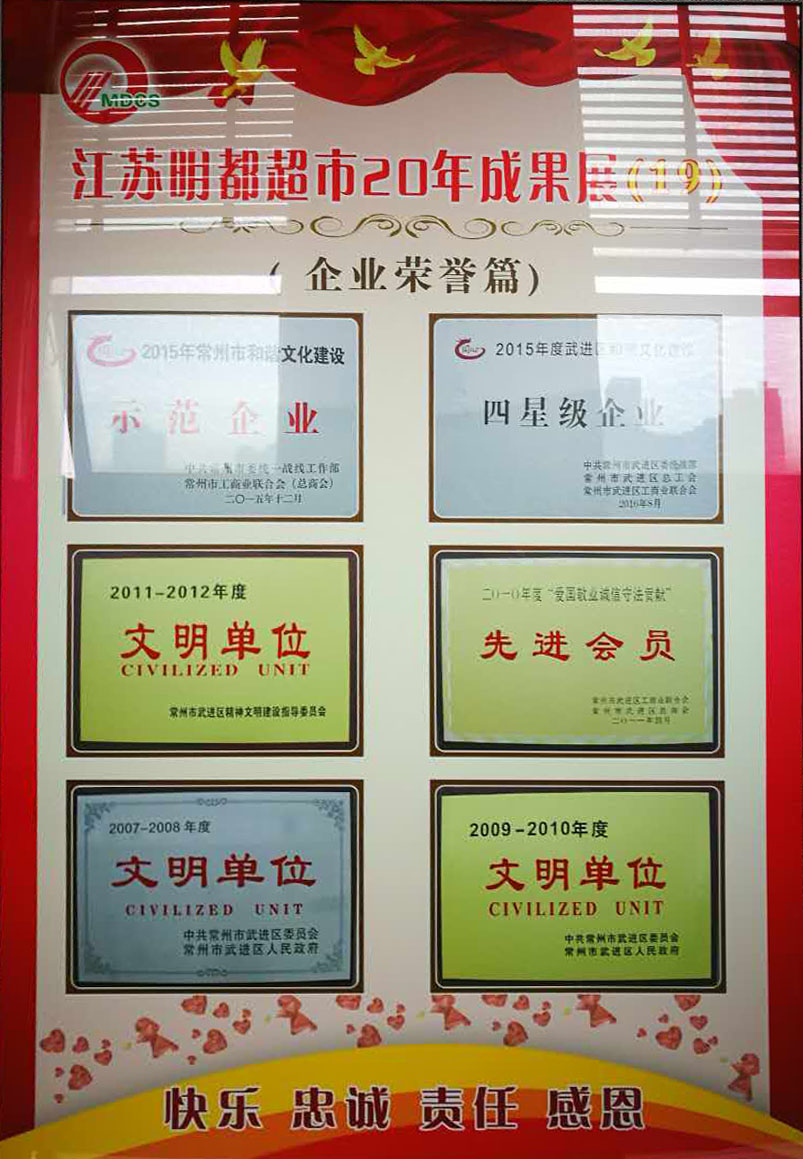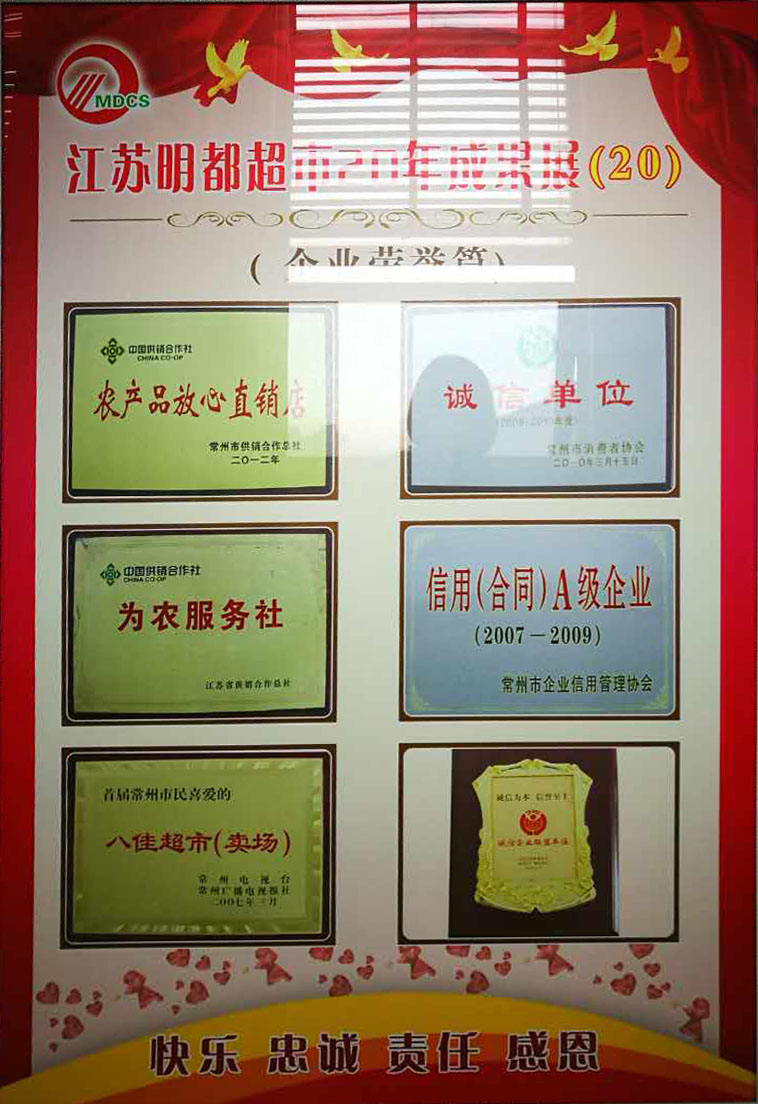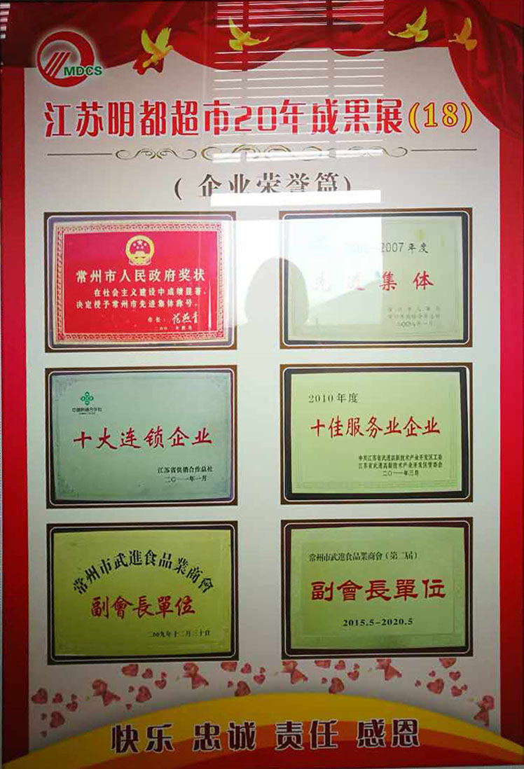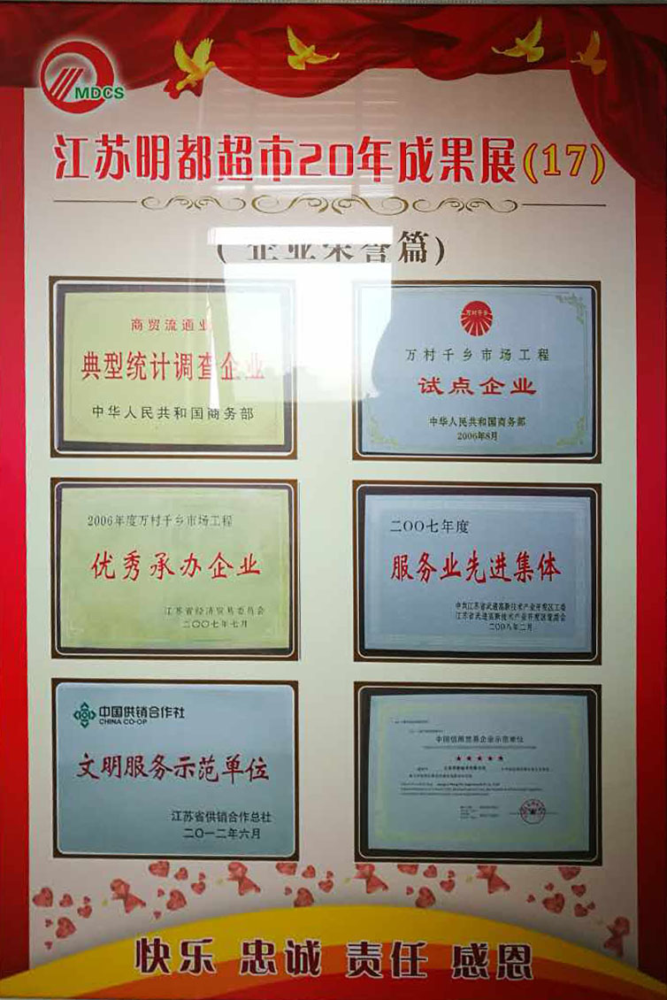 多年來(lái),明都超市從單體商場(chǎng)運(yùn)作到農(nóng)村連鎖經(jīng)營(yíng),從加盟品牌入手到自主創(chuàng)新品牌,成功實(shí)踐了立足農(nóng)村、走進(jìn)社區(qū)、輻射周邊的發(fā)展戰(zhàn)略,牢固確立了以百姓生活用品為主的連鎖經(jīng)營(yíng)業(yè)態(tài)。堅(jiān)持為民服務(wù)方向,積極推進(jìn)農(nóng)超對(duì)接經(jīng)銷各類農(nóng)副產(chǎn)品。為了保持良好的發(fā)展勢(shì)頭,明都超市堅(jiān)持“統(tǒng)一采購(gòu)、統(tǒng)一配送、統(tǒng)一形象、統(tǒng)一核算、統(tǒng)一管理”的連鎖經(jīng)營(yíng)模式;以大批量、大面積、大規(guī)模直接從廠方進(jìn)貨的方式,取得質(zhì)優(yōu)價(jià)廉的商品;堅(jiān)持“品質(zhì)第一,追求卓越”的質(zhì)量承諾;努力實(shí)踐“將更多的實(shí)惠讓給消費(fèi)者”的價(jià)格方針;始終不渝地將“滿足消費(fèi)者的需求”作為最終目標(biāo)。在城鄉(xiāng)市場(chǎng)和廣大消費(fèi)者心中樹立了良好的口碑和聲譽(yù)。多年來(lái),公司取得了多項(xiàng)榮譽(yù),先后被評(píng)為:武進(jìn)區(qū)服務(wù)業(yè)先進(jìn)單位,武進(jìn)區(qū)十大流通服務(wù)先進(jìn)企業(yè),區(qū)級(jí)納稅大戶。2006年—2007年獲得江蘇省供銷社、常州市供銷社系統(tǒng)先進(jìn)集體、三星級(jí)為農(nóng)服務(wù)社,2005年—2008價(jià)格A級(jí)誠(chéng)信單位,消費(fèi)、計(jì)量、質(zhì)量誠(chéng)信單位、文明單位,2007年—2010年信用(合同)A級(jí)企業(yè),2007年“百城萬(wàn)店”無(wú)假貨示范店、市民評(píng)選八佳超市,2006年獲得國(guó)家商務(wù)部“萬(wàn)村千鄉(xiāng)”市場(chǎng)工程試點(diǎn)企業(yè)及優(yōu)秀承辦企業(yè),2008年省放心消費(fèi)者示范單位等多項(xiàng)榮譽(yù)稱號(hào)。