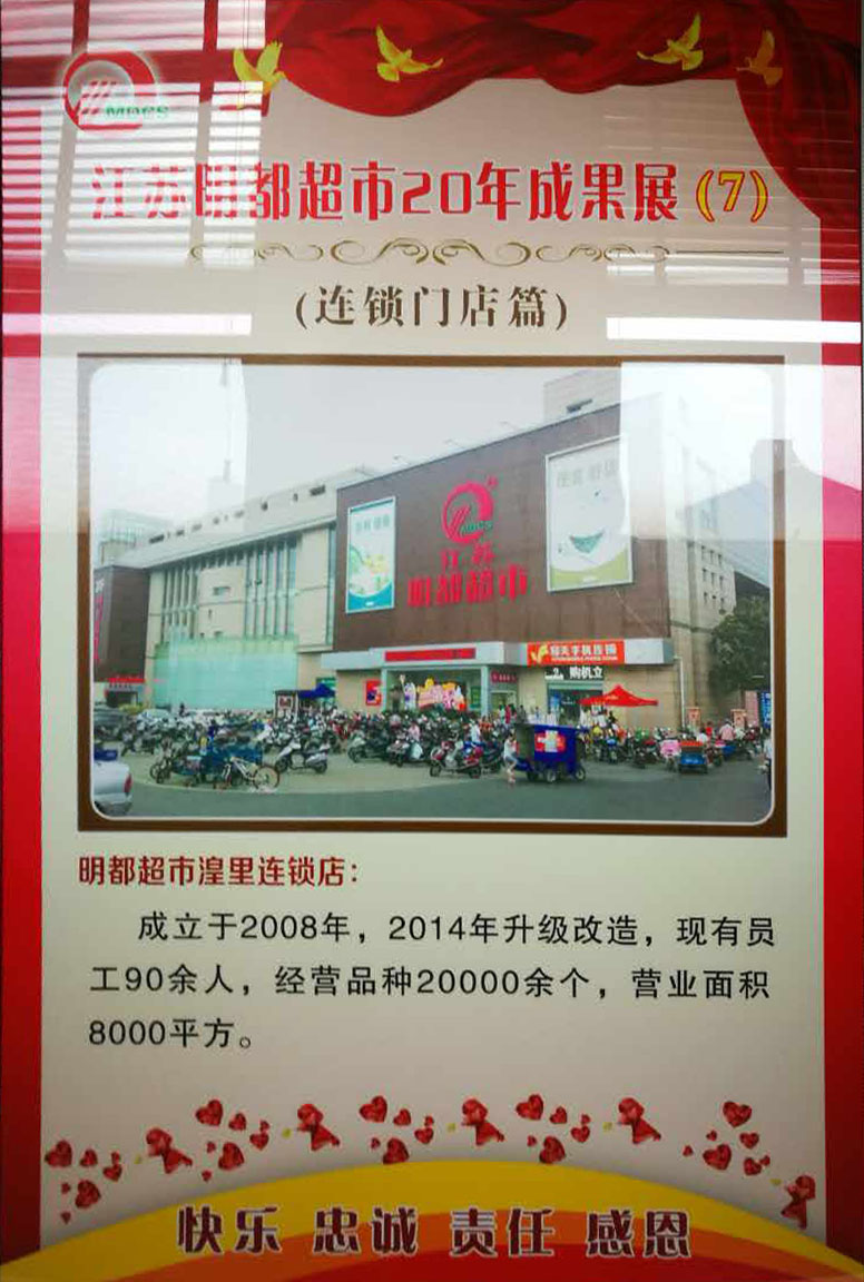 明都超市自創(chuàng)業(yè)以來(lái),始終堅(jiān)持“真誠(chéng)樹商譽(yù)”的發(fā)展理念,以提升消費(fèi)者生活品位為己任,不斷開拓進(jìn)展。以“明都”為品牌的生活用品超市遍布常州30多個(gè)行政鄉(xiāng)鎮(zhèn)及周邊地區(qū),網(wǎng)絡(luò)覆蓋率達(dá)70%。在冊(cè)職工2000余人,營(yíng)業(yè)面積達(dá)16萬(wàn)平方米,建有5萬(wàn)平方米配送中心一個(gè)。2010年實(shí)現(xiàn)銷售總額6億多元,上繳稅費(fèi)為1500萬(wàn)元。為發(fā)揮骨干連鎖經(jīng)營(yíng)企業(yè)輻射帶動(dòng)作用、完善城鄉(xiāng)結(jié)合、上下貫通區(qū)、鎮(zhèn)、村三級(jí)日用消費(fèi)品現(xiàn)代經(jīng)營(yíng)網(wǎng)絡(luò)做出了應(yīng)有貢獻(xiàn)。是常武地區(qū)管理規(guī)范、形象統(tǒng)一、信譽(yù)優(yōu)良、綜合實(shí)力較強(qiáng)的連鎖超市企業(yè)。