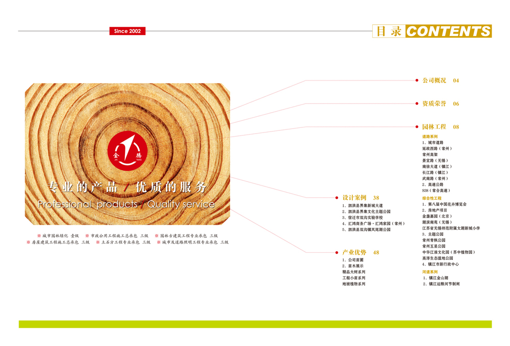 公司成立以后,已迅速占領(lǐng)園林工程施工市場,以先進的工藝和嚴格的管理,令企業(yè)展現(xiàn)出時代的爆發(fā)力,先后承接 連云港經(jīng)濟技術(shù)開發(fā)區(qū)經(jīng)一路(新港路-先鋒路)、金鄉(xiāng)縣北外環(huán)(金沙路-105國道)綠化工程項目、無錫錢橋市民廣場景觀工程、高淳縣人民廣場、第八屆花博會室外展區(qū)建設(shè)、潁上縣五里湖濕地公園三期景觀工程、常州市青楓公園綠化景觀工程、河南甕澗河綠化工程施工項目等大中型園林綜合性工程。公司人員利用自身優(yōu)勢,精心設(shè)計,積極創(chuàng)新,受到社會各界的普遍好評,塑造了良好的企業(yè)形象。