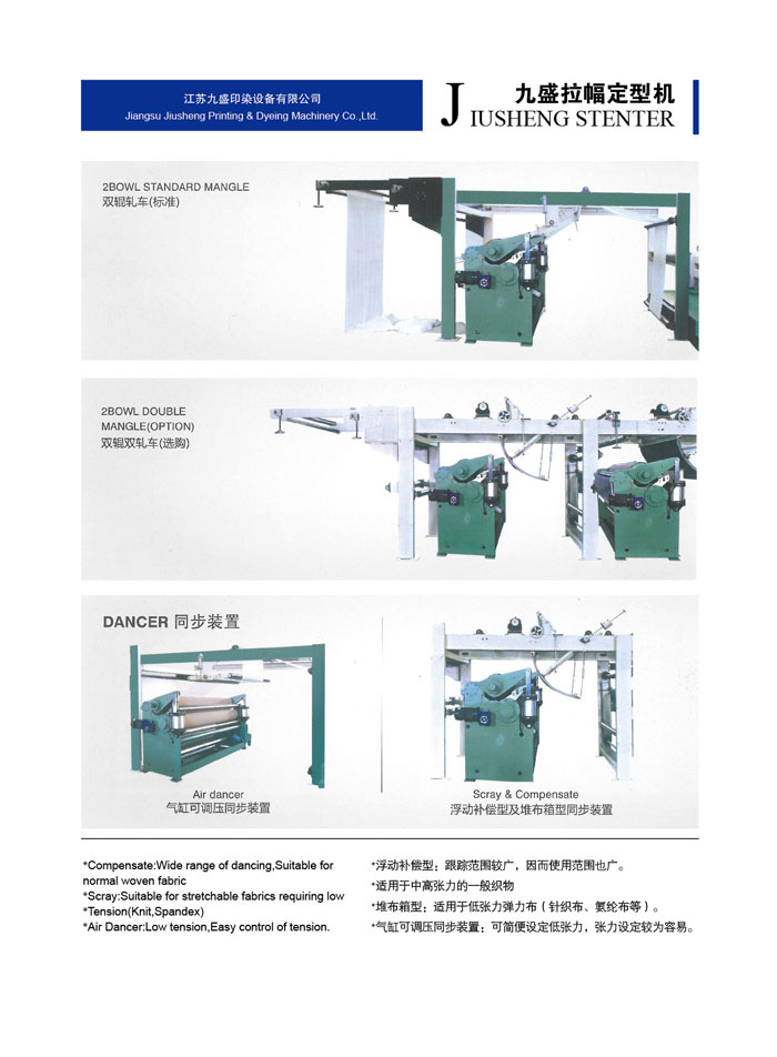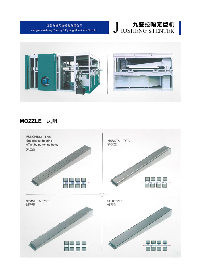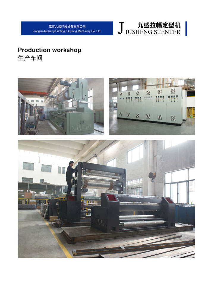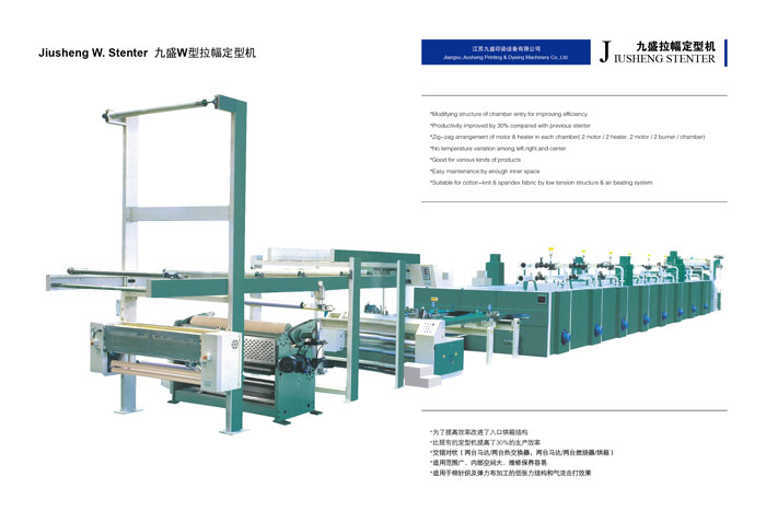 江蘇九盛印染設(shè)備有限公司(原江蘇鵬輝印染機械有限公司)創(chuàng)建于1986年,北長江,所在地區(qū)內(nèi)鐵路、高等級公路縱橫成網(wǎng),常州長江公路大橋飛架大江南北,水陸交通十分便利。公司有近二十年的熱定型機設(shè)計、生產(chǎn)經(jīng)驗、有批從事新型熱定機開發(fā)、設(shè)計的專業(yè)人才,具有豐富生產(chǎn)和制作經(jīng)驗的技師和技工。已成為國內(nèi)頗具名聲的機械制作企業(yè)。 樹脂定型是染整工程最后的程序,因此定型機的設(shè)計及操作技術(shù)成為決定織物品質(zhì)重要的一環(huán),九盛公司多年的經(jīng)驗改良完成新生代定型機,針對業(yè)者需要對于節(jié)省人力布匹張力的減少、緯紗的調(diào)整,風量的調(diào)節(jié),布邊控制及切邊損耗及至于熱能保持,維修工作,操作管理都有卓越表現(xiàn)及實際成果,而機械的研制及生產(chǎn)技術(shù)的發(fā)展是本公司創(chuàng)立的目標和宗旨。