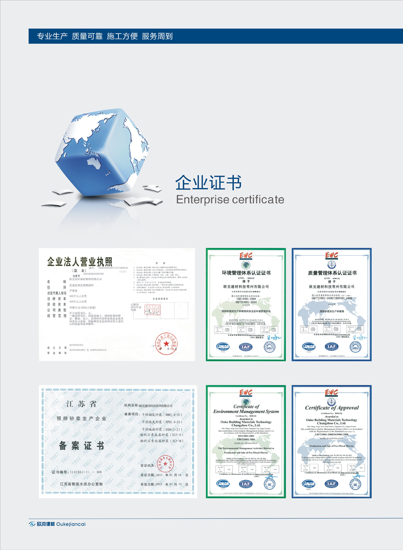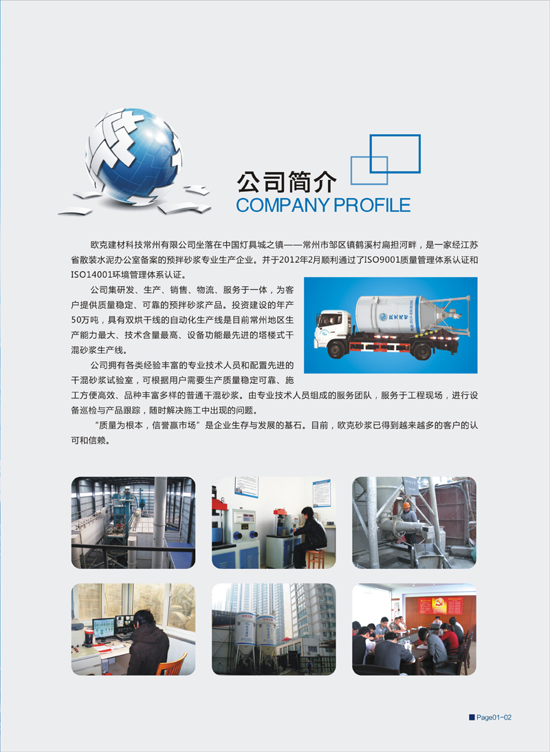 歐克建材科技常州有限公司坐落在中國燈具城之鎮(zhèn)——常州市鄒區(qū)鎮(zhèn)鶴溪村扁擔(dān)河畔,是一家經(jīng)江蘇省散裝水泥辦公室備案的預(yù)拌砂漿專業(yè)生產(chǎn)企業(yè)。并于2012年2月順利通過了ISO9001質(zhì)量管理體系認(rèn)證和ISO14001環(huán)境管理體系認(rèn)證。 公司集研發(fā)、生產(chǎn)、銷售、物流、服務(wù)于一體為客戶提供質(zhì)量穩(wěn)定、可靠的預(yù)拌砂漿產(chǎn)品。投資建設(shè)的年產(chǎn)50萬噸,具有雙烘干線的自動化生產(chǎn)線是目前常州地區(qū)生產(chǎn)能力最大、技術(shù)含量最高、設(shè)備功能最先進的塔樓式干混砂漿生產(chǎn)線。 公司擁有各類經(jīng)驗豐富的專業(yè)技術(shù)人員和配置先進的干混砂漿試驗室,可根據(jù)用戶需要生產(chǎn)質(zhì)量穩(wěn)定可靠、施工方便高效、品種豐富多樣的普通干混砂漿。由專業(yè)技術(shù)人員組成的服務(wù)團隊,服務(wù)于工程現(xiàn)場,進行設(shè)備巡檢與產(chǎn)品跟蹤,隨時解決施工中出現(xiàn)的問題。 “質(zhì)量為根本,信譽贏市場”是企業(yè)生存與發(fā)展的基石。目前,歐克砂漿已得到越來越多的客戶的認(rèn)可和信賴。