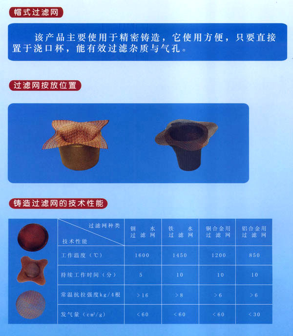 常州市猛將過濾網(wǎng)有限公司是專業(yè)生產(chǎn)系列鑄造過濾網(wǎng)的廠家。主要產(chǎn)品有:鐵水過濾網(wǎng)、鋼水過濾網(wǎng)、銅水過濾網(wǎng)、鋁水過濾網(wǎng)及熔模用帽式過濾網(wǎng)等。本廠產(chǎn)品是哈工大科研成果,榮獲國家經(jīng)委頒發(fā)的新技術(shù)成果獎。航天部科技進(jìn)步一等獎;中國質(zhì)量檢驗協(xié)會授予“猛將”牌高硅氧過濾網(wǎng)“國家權(quán)威檢測達(dá)標(biāo)產(chǎn)品”榮譽(yù)證書;我廠生產(chǎn)的“四角帽式過濾網(wǎng)”獲國家專利局外觀設(shè)計專利證書;并獲香港國際新技術(shù)新產(chǎn)品博覽會“金獎證書”。2002年獲亞洲國際新技術(shù)新產(chǎn)品博覽會“科技發(fā)明進(jìn)步獎”,2002年本廠所生產(chǎn)的“四角帽式過濾網(wǎng)在首屆“金艦杯”國際新技術(shù)成果網(wǎng)絡(luò)交易會活動中成績顯著,被評為金杯獎。同年在日內(nèi)瓦國際專利技術(shù)成果博覽會中被評為國際優(yōu)秀專利金獎。目前,本廠產(chǎn)品銷往全國各省、市、自治區(qū),是國內(nèi)銷量最大的廠家之一。同時出口韓國、泰國、東南亞等國家。進(jìn)入21世紀(jì)以來,我國加入WTO后,我廠在哈工大葉榮茂教授的指導(dǎo)下,開發(fā)研制出一種多孔泡沫陶瓷過濾網(wǎng),該產(chǎn)品兼具玻璃纖維過濾網(wǎng)和直孔過濾網(wǎng)的篩分夾渣功能,且更具有吸附微小夾渣氧化物的功能。多孔泡沫陶瓷過濾網(wǎng)的主要工作原理是讓紊亂、翻騰的(TV urbuItnt Flow)金屬液經(jīng)過產(chǎn)品形成平穩(wěn)、均勻(SmoothFlow)的金屬液,金屬液經(jīng)過復(fù)雜的多孔泡沫陶瓷過濾網(wǎng),能有效地吸附截留微小氧化夾渣物,并溢除氣泡,然后能使鑄件產(chǎn)品達(dá)到純潔度高、強(qiáng)度高、韌性好、機(jī)械加工性能好等特點,從而能夠降低生產(chǎn)成本,提高產(chǎn)品成品率,增加經(jīng)濟(jì)效益。我廠熱忱歡迎廣大用戶使用該產(chǎn)品。 我公司設(shè)計發(fā)明的“四角帽式過濾網(wǎng)”,已在2001年3月申請專利,并于當(dāng)年11月底經(jīng)中華人民共和國知識產(chǎn)權(quán)局授權(quán)公告。頒布了外觀設(shè)計專利證書,證書號第207620號,F(xiàn)有個別廠家悍然侵權(quán),公然在有關(guān)鑄造媒體打出侵權(quán)產(chǎn)品廣告。對此,我們鄭重聲明,要求侵權(quán)廠家盡快采取糾正措施,為了維護(hù)我們的知識產(chǎn)權(quán),我們不排除采取法律行動的可能。