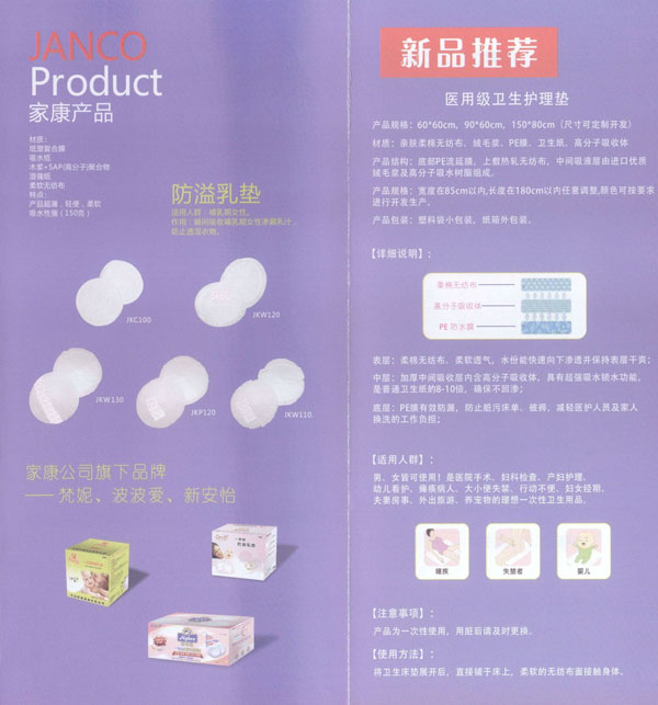 中國(JANCO)家康衛(wèi)生用品公司成立于2004年,我們專注于研發(fā)、設(shè)計(jì)、及制造健康的衛(wèi)生用品。我們的產(chǎn)品包括防溢乳墊、汗墊、寶寶背墊、圍兜、護(hù)理墊等。我們的生產(chǎn)廠房建設(shè)在中國江蘇省常州市,這是一個(gè)非常美麗的城市,并且我們的廠區(qū)鄰近沿江高速,交通非常便利。 我們擁有國際一流的生產(chǎn)設(shè)備、先進(jìn)的檢測(cè)儀器、無菌的生產(chǎn)車間。我們每一個(gè)產(chǎn)品都經(jīng)過家康人專心、專業(yè)的制造,我們注重每一個(gè)細(xì)節(jié),不斷的研發(fā)更舒適、更健康、更人性化的產(chǎn)品,旨在為您提供更滿意的服務(wù)。我們也可以根據(jù)您的需求研發(fā)、設(shè)計(jì)、生產(chǎn)不同的產(chǎn)品。我們的產(chǎn)品已遠(yuǎn)銷海外,并且得到非常好的評(píng)價(jià)。出口的國家有美國、加拿大、英國、意大利、俄羅斯、南非、泰國等。人性化的設(shè)計(jì)、優(yōu)秀的品質(zhì)、完善的售前、售后服務(wù)及合理的價(jià)格使我們的客戶與我們的合作感到非常的愉快。 我們已經(jīng)通過了ISO9000和FDA認(rèn)證,我們將感到非常榮幸能夠與您合作。 我們非常樂意與中國的經(jīng)銷商共同分享我們的產(chǎn)品,我們將非常期待您的信任和加盟。 我們將一如既往的為您提供:更舒適的、更健康的產(chǎn)品。