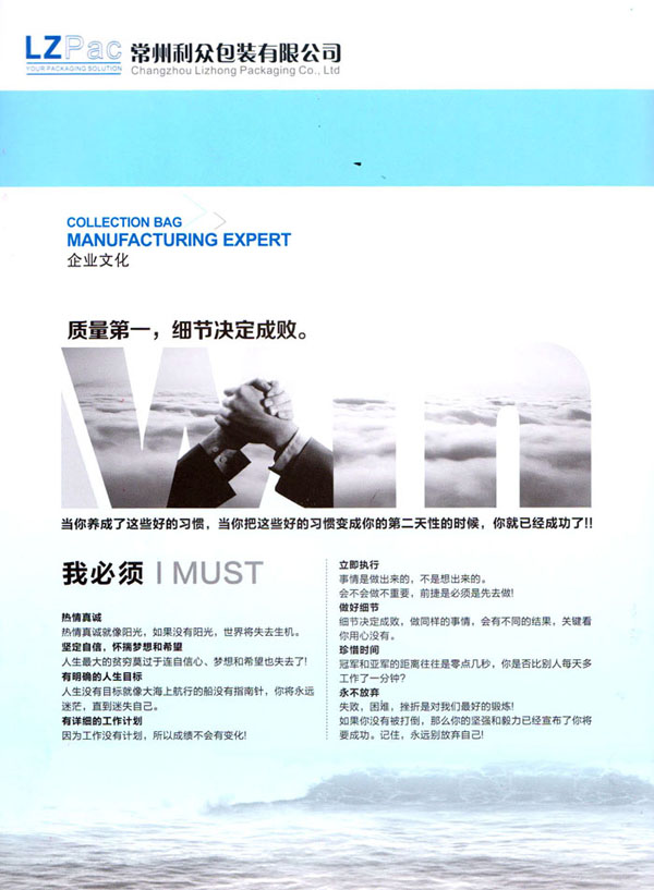 常州利眾包裝有限公司成立于2009年。經(jīng)過10多年的發(fā)展,已發(fā)展成為規(guī)模型的集成袋生產(chǎn)與研發(fā)基地。公司擁有四條拉絲生產(chǎn)線,20余臺各式圓織機、10余臺織帶機,1臺寬幅涂膜機,10余臺自動裁剪機,200多臺各式縫紉設(shè)備,其中電腦縫紉設(shè)備多達40多臺。公司月產(chǎn)各種中高檔集裝袋20萬條左右。 擁有強大的質(zhì)量管理系統(tǒng)。公司成立初期就通過了ISO9001的體系論證。公司奉行“質(zhì)量第一,客戶至上”的經(jīng)營理念,始終堅持以質(zhì)量謀發(fā)展的原則,執(zhí)著追求以新工藝,新設(shè)備,高效率不斷優(yōu)化生產(chǎn)流程,降低生產(chǎn)成本以適應(yīng)市場。常州利眾包裝有限公司地處美麗的江南水鄉(xiāng)——常州。地理位置十分優(yōu)越。 公司主打產(chǎn)品為各種中高端集裝袋。包括各式拉筋袋,導電袋,抗靜電袋。公司客戶清單中包括有很多的國際知名企業(yè),世界500強企業(yè)。 眾包裝——你的包裝解決方案。