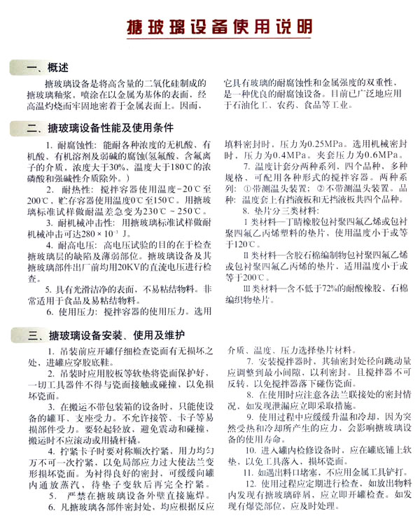 “利景”牌搪玻璃設備兼金屬材料的剛性和無機金屬材料的耐腐蝕性之雙重優(yōu)點,搪玻璃層表面光滑、清洗方便,能隔離金屬離子,不污染也不粘物料,在化工、石油、農藥、染料、塑料、食品等行業(yè)得到廣泛應用。
