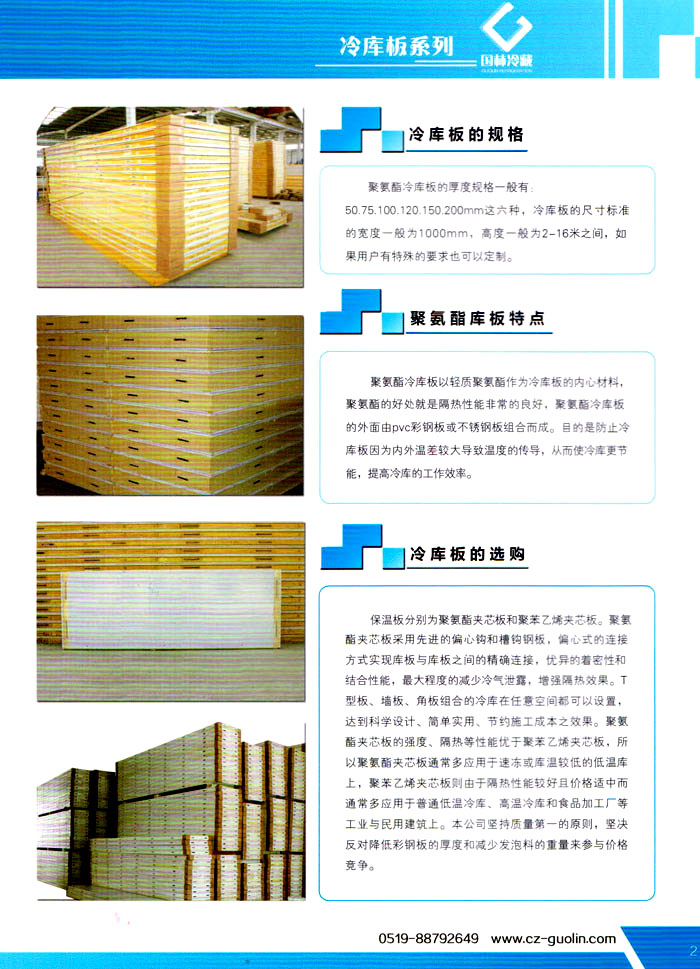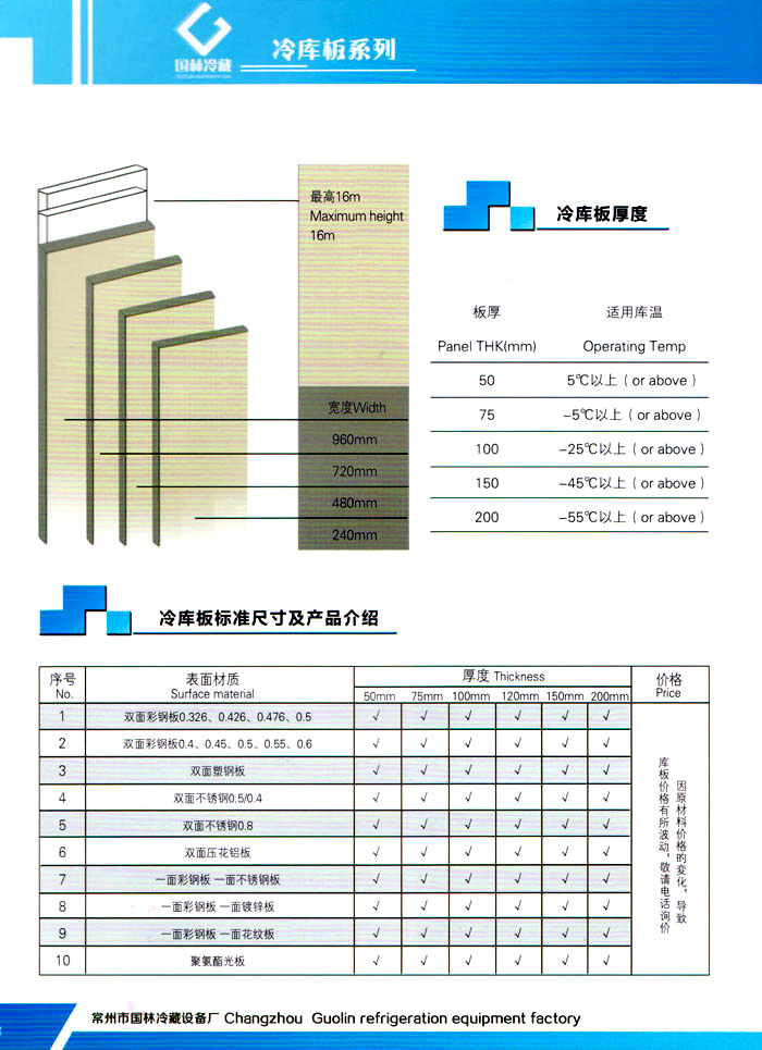 常州市國(guó)林冷藏設(shè)備廠***生產(chǎn)7.5公分,10公分,12公分,15公分,20公分的聚氨酯冷庫(kù)板,面板包括彩鋼板、不銹鋼板、壓花鋁板等各種板材,各種冷庫(kù)半埋門及平移動(dòng)門,各種鐵排管和鋁排管,價(jià)格優(yōu)惠,有需要的可以聯(lián)系我金文燁18761183807