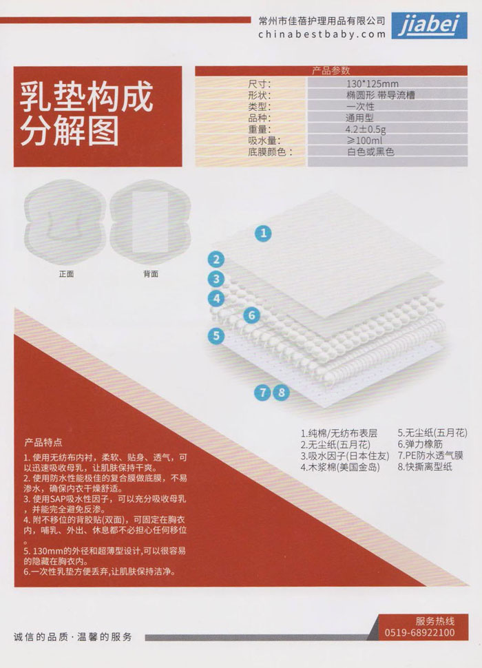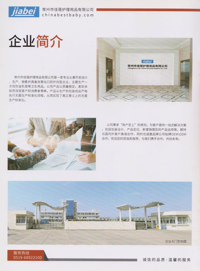 常州市佳蓓護(hù)理用品有限公司是一家專業(yè)從事開發(fā)、生產(chǎn)、銷售并具備自營(yíng)出口的外向型企業(yè),主要生產(chǎn)“一次性防溢乳墊“,以質(zhì)量穩(wěn)定,柔軟親膚而深受客戶和消費(fèi)者青睞。本公司產(chǎn)品從生產(chǎn)到包裝成品嚴(yán)格執(zhí)行無(wú)菌生產(chǎn)標(biāo)準(zhǔn)化流程,并和設(shè)備生產(chǎn)廠家合作開發(fā)了兩條從進(jìn)料、生產(chǎn)、檢測(cè)、滅菌、成品包裝的無(wú)菌生產(chǎn)線,從而實(shí)現(xiàn)了真正意義上的無(wú)菌生產(chǎn)標(biāo)準(zhǔn)化。 佳蓓秉承”用戶至上“的原則,期待與國(guó)內(nèi)外客戶真誠(chéng)合作,同時(shí)也誠(chéng)邀品牌公司貼牌合作,歡迎您的蒞臨和指導(dǎo),與我們攜手合作,共創(chuàng)未來。