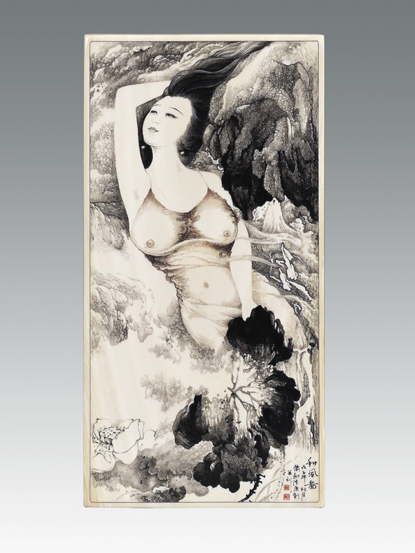 1 牙刻《和風(fēng)圖》是極具創(chuàng)意構(gòu)思新穎的原創(chuàng)作品,水墨雅韻橫生,荷花玉色高潔,仙子和風(fēng)飄逸。作品以花擬人以人喻花,兼工帶寫相應(yīng)成輝,刀法隨意而變,大膽強(qiáng)調(diào)紅與黑的民族審美符號(hào),抒發(fā)作者對(duì)美的呼喚、對(duì)荷的傾訴。仙子冰雪的肌膚,豐美的體態(tài),洋溢著青春的氣息,散發(fā)出蓬勃的生機(jī)。