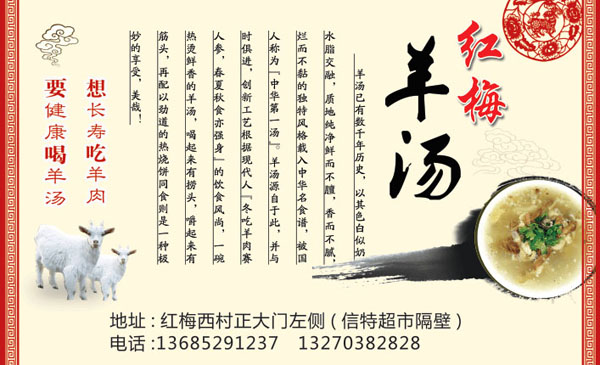 天寧區(qū)紅梅奧彩小吃店(紅梅羊湯店)成立十四年,特色是羊湯, 羊肉是中國(guó)人民食用的主要肉類之一.羊肉比其他肉類的肉質(zhì)要細(xì)嫩,而且膽固醇含星低。相對(duì)其他肉類而言,羊肉蛋白質(zhì)含量較多,脂肪含量較少。維生素B1、B2、B6以及鐵、鋅、硒的含量頗為豐富。此外,羊肉肉質(zhì)細(xì)嫩容易消化吸收.多吃羊肉有助于提高身體免疫力。 羊肉熱量比牛肉要高.中醫(yī)認(rèn)為,羊肉具有補(bǔ)精血,益虛勞.溫中健脾,補(bǔ)腎壯陽(yáng),養(yǎng)薛等功能,尤其適合老年人、體虛的人群食用。 羊肉的大部分脂肪都可看得見(jiàn),很容易去除。羊腿部肉、肋骨和腰部肉比肩胛肉瘦。每100克烤羊腿中.含蛋白質(zhì)28克、脂肪7克、膽固醇100毫克.能提供的熱量是757.7千焦。 羊羔肉富含蛋白質(zhì)、鋅和維生素B族,其中煙酸、維生素B2和維生素B12的含量壟基圭富.羊羔肉中鎂、鉀和磷的含量也較高,并易于吸收。