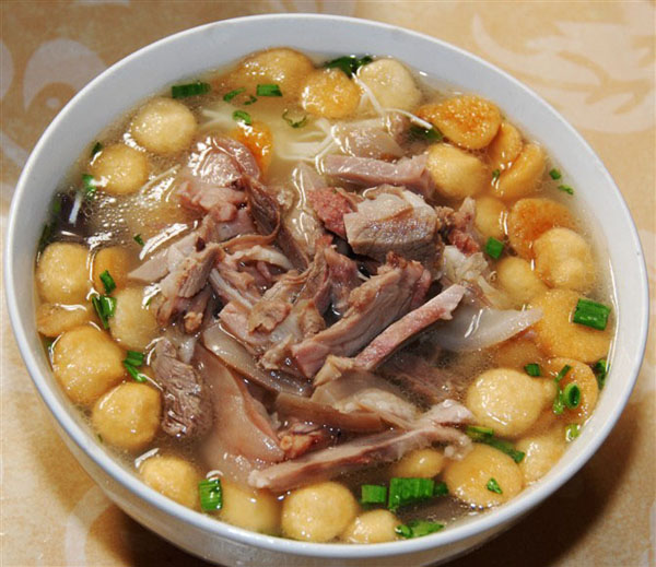 牟利英走進廚房給客人盛羊湯,只見她在漏勺里放入百葉絲和豆炙餅,入鍋燙熟,倒入一只大碗,再倒入一碟羊雜碎,然后舀起一勺篤得奶白的羊骨頭湯,手腕一翻倒入碗里,熱騰騰、香噴噴的一碗羊湯就做好了,此時別忘了往湯里扔一小撮碧綠生青的蒜葉提香。趁熱喝,從嘴里一直熱到胃里,就連整個人似乎也跟著暖熱了起來。談旭東在一邊說,他小時候,羊肉館里用的豆炙餅還是自家熯的(熯,音同“漢”,意為焙或用極少的油煎),現(xiàn)在雖說是別人供貨的,但也算是特制的,要關照多熯一會兒,這樣才不會一下鍋就篤爛,拿回家后,他還要再用油爆香,放在湯里才更好吃。