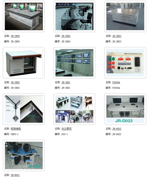 “久瑞”牌產(chǎn)品覆蓋:電子計(jì)算機(jī)、通訊網(wǎng)絡(luò)、公路交通、廣播電視、樓宇數(shù)控、電力輸配、教育設(shè)施、辦公設(shè)備。配套產(chǎn)品如監(jiān)控屏幕墻、控制操作臺、多媒體講臺、另外還有防靜電地板、屏風(fēng)隔墻、文件柜、辦公桌、更衣室、工作臺、工具箱、貨架、實(shí)驗(yàn)桌等。