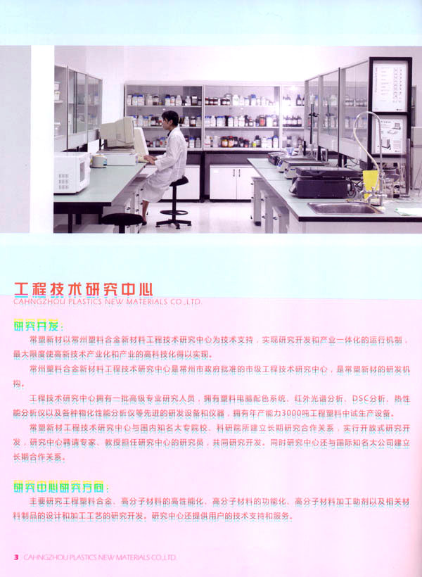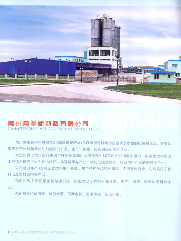 常州常塑新材料有限公司(原名常州塑料集團(tuán)新材料有限公司)是一家民營股份制企業(yè)。主要從事高分子材料和塑料助劑的研究開發(fā)、生產(chǎn)、銷售、服務(wù)。 常塑新材料以常州塑料集團(tuán)與韓國新湖油化合資建設(shè)的10萬噸ABS樹脂為基礎(chǔ),和與德國吉瑪公司合資建設(shè)的20萬噸PET樹脂。以常州塑料集團(tuán)工程技術(shù)研究中心為技術(shù)依托,實(shí)現(xiàn)科研與產(chǎn)業(yè)一體化的組合模式。 公司建設(shè)年產(chǎn)3萬噸工程塑料生產(chǎn)基地,生產(chǎn)各種阻燃ABS、耐熱ABS樹脂、工程塑料合金、功能高分子材料以及塑料助劑等產(chǎn)品。 公司目標(biāo):把常塑新材料建設(shè)成一流的高分子材料研究開發(fā)、生產(chǎn)、銷售、服務(wù)的高科技企業(yè)。 公司理念和價(jià)值觀:誠信經(jīng)營、不斷創(chuàng)新、追求卓越、創(chuàng)造價(jià)值。 公司旨在創(chuàng)造以人為本不斷創(chuàng)新的企業(yè)可持續(xù)發(fā)展的核心競(jìng)爭力,為社會(huì)創(chuàng)造價(jià)值。