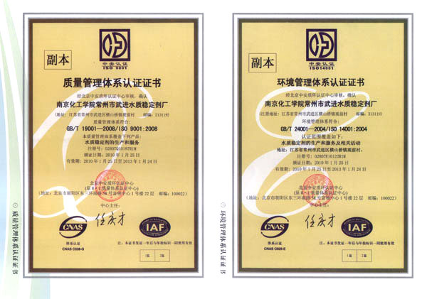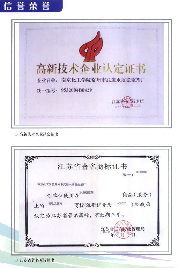 企業(yè)運(yùn)用嚴(yán)密的科學(xué)管理,配有先進(jìn)的工藝技術(shù)和精良的生產(chǎn)裝備,保持高標(biāo)準(zhǔn)的產(chǎn)品質(zhì)量。所生產(chǎn)的水質(zhì)穩(wěn)定劑達(dá)到或超過國際先進(jìn)水平,擁有PBTCA等多個(gè)江蘇省高新技術(shù)產(chǎn)品,DPSC緩蝕阻垢劑被列為國家星火計(jì)劃項(xiàng)目,工業(yè)循環(huán)水用新型緩蝕阻垢殺菌劑被國務(wù)院評為國家科技進(jìn)步二等獎(jiǎng)。主要產(chǎn)品均通過部、省級科技成果鑒定,連續(xù)十多年被中國石化總公司評定為合格推薦產(chǎn)品。企業(yè)已通過IS09001、IS014001國際質(zhì)量、環(huán)境認(rèn)證,為國內(nèi)外石化行業(yè)、冶金、鋼鐵、化肥、電力、紡織等領(lǐng)域的工業(yè)循環(huán)冷卻水的水質(zhì)處理提供了必不可少的配套產(chǎn)品。