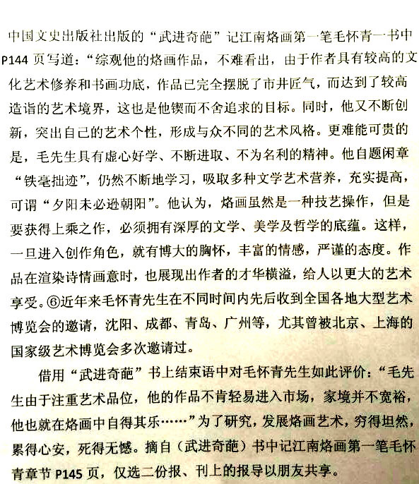 毛懷青,江蘇常州市武進(jìn)人。 中國(guó)工藝美術(shù)學(xué)會(huì)會(huì)員,常州市中國(guó)烙畫研究會(huì)副會(huì)長(zhǎng),常州市文博鑒賞協(xié)會(huì)理事,非物質(zhì)文化遺產(chǎn)烙畫傳承人。高級(jí)工藝美術(shù)師。 年輕時(shí)學(xué)習(xí)國(guó)畫、油畫中年蔓現(xiàn)掌州咯畫源遠(yuǎn)流長(zhǎng)、歷史悠久,有著其它美術(shù)門類不具備的藝術(shù)風(fēng)格與特色?芍^是工藝美術(shù)中的一朵十分亮麗的藝術(shù)奇葩,是我民族先人給我們留下的一份不可多得十分珍貴的一份文化遺產(chǎn)。為弘揚(yáng)與發(fā)展這份優(yōu)秀文化遺產(chǎn),我從此下定決心研究烙畫,愿付出一份力量為振興烙畫事業(yè)做出貢獻(xiàn)。至今已潛心研究幾十年,取得了可喜的成績(jī),被業(yè)界公認(rèn),社會(huì)關(guān)注與認(rèn)可。有“江南烙畫第一筆”之美譽(yù)。 近年來(lái),創(chuàng)作的烙畫作品分別獲得過(guò)全國(guó)、省市級(jí)的金、銀、銅獎(jiǎng)多次。中央電視臺(tái)曾兩次播放過(guò)本人的烙畫作品,江蘇電視臺(tái)、常州電視臺(tái)也曾多次播放過(guò)本人的作品與烙畫藝術(shù)生涯,揚(yáng)子晚報(bào)、常州日?qǐng)?bào)、常州晚報(bào)也曾多次報(bào)導(dǎo)過(guò)本人的烙畫作品,出版物有三種版本都能查閱到介紹本的烙畫從藝生涯與藝術(shù)業(yè)績(jī)。