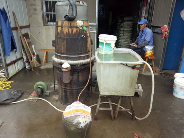 第四步:放入缸中,酒曲和糯米拌好后,便可放入屋內(nèi)的大缸中,并在其中挖出個(gè)圓形的洞,放入竹筒做酒窩。在此之前,大缸可用之前冷卻糯米飯的溫水擦一擦暖缸,這樣更有益于酒曲發(fā)酵。為了保證酒曲發(fā)酵的溫度,還要給酒料附上塑料薄膜。若是氣溫低于零度,還得多蓋上幾層棉被才行。像池阿姨家的400斤糯米,老徐至少要重復(fù)這些步驟八遍!大缸中的酒料大約發(fā)酵了10天左右,在酒乳已非常豐富之際,按照1:1的比例,打開封口加入冷開水,然后再蓋上棉被。繼續(xù)放置45天后,米酒才算大功告成!如果覺得米酒不過癮,老徐還會將米酒吊成燒酒,也就是白酒,依舊是傳統(tǒng)的老手藝。未來某天,TA會消失 ,其實(shí),做米酒的方法并不難,幾乎是以前家家戶戶的必備技能。然而現(xiàn)如今,不僅老常州們不再自己做酒,就連像老徐這樣的做米酒手藝人也越來越少。就連跟了老徐三十多年的一套米酒家當(dāng),也同樣經(jīng)不起歲月:鐵鍋漏了要去找橫山橋的老師傅;木桶壞了要去禮嘉修;爐子也有專門的式樣,過幾年就要拿著圖紙找人翻新......