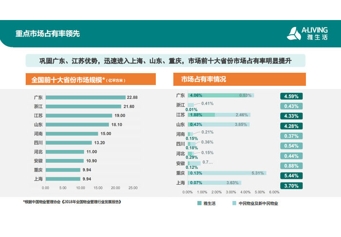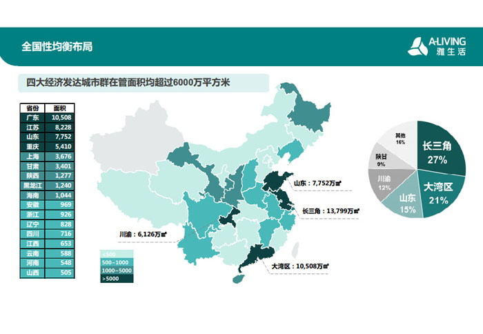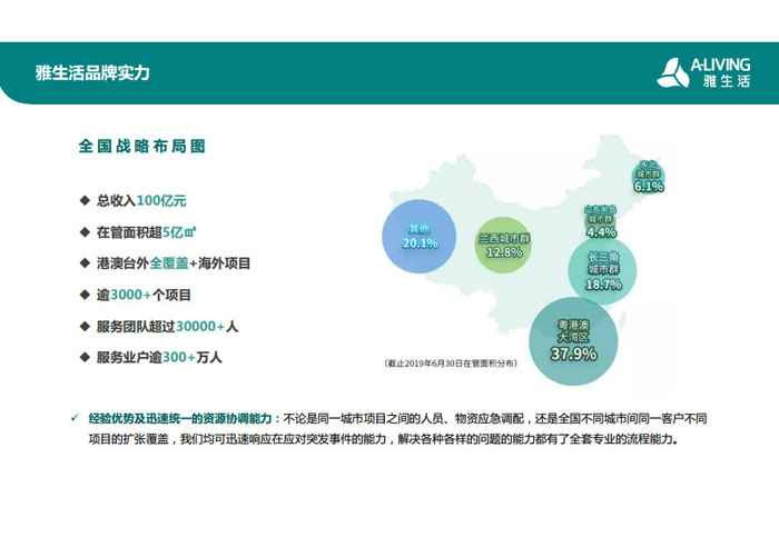 一、立足北上廣,面向全中國,走向全世界 1992年,雅居樂物業(yè)開篇中山,率先引入港式物業(yè)管理模式。1997年,依托雅居樂地產(chǎn)的崛起,連續(xù)接管中山多個項目,成為高端大盤物業(yè)管理的領(lǐng)跑者。1999年,雅居樂物業(yè)開啟專業(yè)化發(fā)展模式,全面通過英國皇家BSI的ISO9000質(zhì)量管理體系認證,2001年成為國家首批一級物業(yè)管理資質(zhì)企業(yè)。 2002年,隨著廣州雅居樂花園的盛大啟幕,雅居樂物業(yè)邁開向廣州進軍的步伐。為尋求更長遠的發(fā)展,雅居樂積極構(gòu)思上市藍圖,2005年在香港成功上市。在深耕珠三角城市群的同時,2006年雅居樂物業(yè)揮師北上,正式開啟全國部署戰(zhàn)略。2008年,接管海南清水灣項目,揭開旅游地產(chǎn)物業(yè)管理的新篇章。 接下來近十年里,雅居樂物業(yè)始終保持著最年輕的成長姿態(tài),依托“管理數(shù)字化、服務(wù)專業(yè)化、流程標(biāo)準(zhǔn)化和操作機械化”的發(fā)展戰(zhàn)略,雅居樂物業(yè)榮膺2018中國物業(yè)服務(wù)百強企業(yè)第11名,2018年中國物業(yè)服務(wù)百強企業(yè)成長性第二名、2018年中國物業(yè)服務(wù)百強服務(wù)質(zhì)量領(lǐng)先企業(yè)、2018年中國物業(yè)服務(wù)百強滿意度領(lǐng)先企業(yè)、2018中國物業(yè)服務(wù)百強經(jīng)營績效領(lǐng)先企業(yè)、旅游地產(chǎn)物業(yè)管理領(lǐng)先品牌、2018年中國辦公物業(yè)管理優(yōu)秀企業(yè)(綠地物業(yè))、2017中國物業(yè)管理企業(yè)品牌價值第12名、2017中國物業(yè)管理企業(yè)綜合實力第12名、中國藍籌物業(yè)企業(yè)、《旅游地產(chǎn)物業(yè)管理服務(wù)標(biāo)準(zhǔn)》(團體標(biāo)準(zhǔn))起草工作等多項殊榮。 目前,雅生活集團已形成廣州、中山、深圳、南京、上海、西安、成都、海南、云南、北京、鄭州、南寧、沈陽、武漢、馬來西亞十五大城市公司全面發(fā)展的蓬勃態(tài)勢。截止2017年12月31日,雅生活集團管理范圍覆蓋全國逾69座城市與地區(qū),服務(wù)類型涵蓋主流住宅、高端豪宅、旅游地產(chǎn)、商業(yè)、寫字樓等多種業(yè)態(tài),合約總建筑面積為12610萬平方米,擁有200多個項目,服務(wù)業(yè)主逾100萬人。 2017年6月,雅生活集團收購綠地物業(yè)100%股權(quán),并與綠地集團簽署戰(zhàn)略合作協(xié)議,8月,綠地集團投資10億元獲得雅生活集團20%股權(quán)。未來,雅生活集團將實施“雅居樂物業(yè)”與“綠地物業(yè)”雙品牌驅(qū)動戰(zhàn)略,還將尋求在A股上市,力爭打造中國物業(yè)“A+H”第一股。