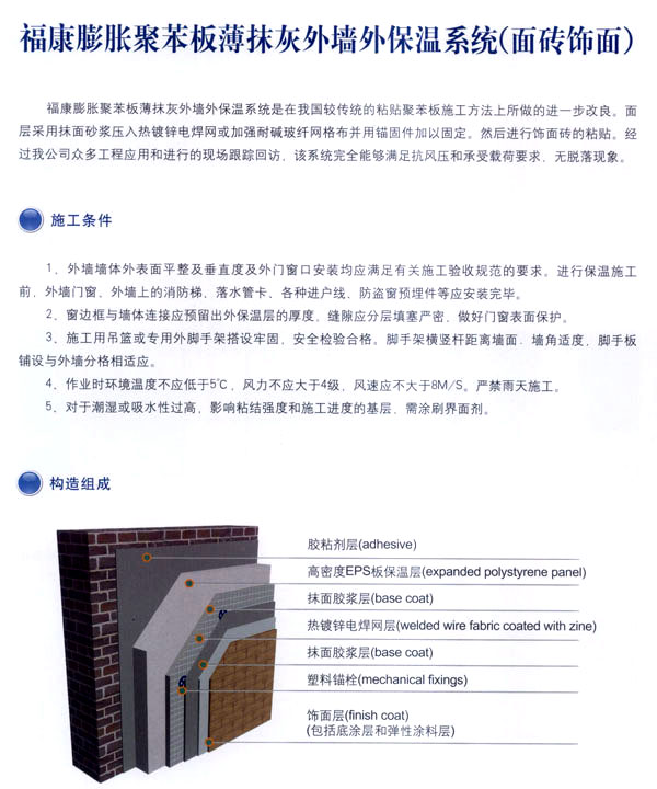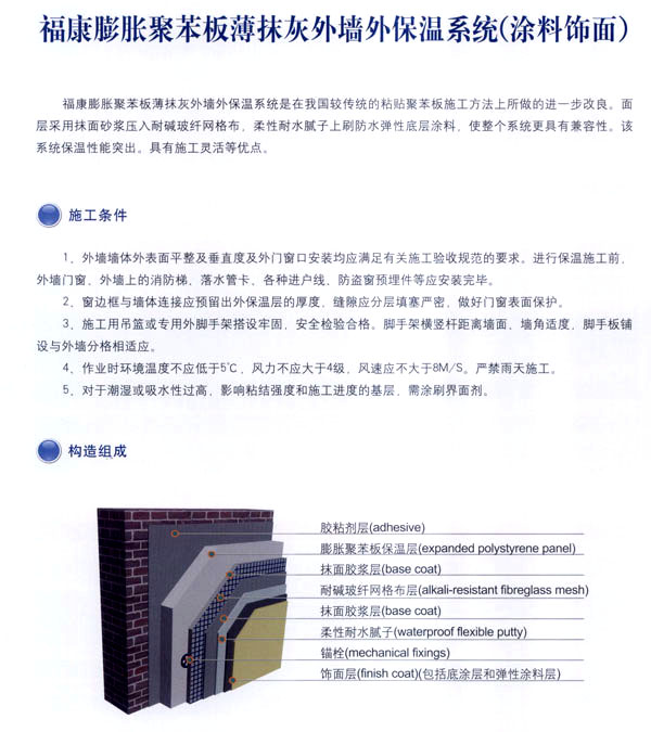 常州市?敌滦徒ú挠邢薰臼且匝兄崎_(kāi)發(fā)、生產(chǎn)、銷(xiāo)售、施工、技術(shù)服務(wù)為一體的化學(xué)建筑材料的專(zhuān)業(yè)企業(yè),通過(guò)與歐洲著 名建筑材料公司和國(guó)內(nèi)權(quán)威科研機(jī)構(gòu)合作,并聘請(qǐng)國(guó)家級(jí)專(zhuān)家為技術(shù)顧問(wèn),開(kāi)發(fā)出適合我國(guó)市場(chǎng)的?礒PS、XPS及聚苯顆粒外墻外保溫節(jié)能系統(tǒng)。 公司的生產(chǎn)線(xiàn)全部采用國(guó)內(nèi)先進(jìn)的電腦控制自動(dòng)化設(shè)備,配備了專(zhuān)業(yè)的實(shí)驗(yàn)中心,并且采用進(jìn)口的可再分散乳膠粉為基料,確保福康外墻外保溫節(jié)能系統(tǒng)具有性能優(yōu)異、安全可靠,綠色環(huán)保、適用性強(qiáng)的高品質(zhì)特點(diǎn)。 公司開(kāi)發(fā)的\'福康外墻外保溫系統(tǒng)\'被列為江蘇省科技成果推廣項(xiàng)目。整個(gè)生產(chǎn)流程依照質(zhì)量體系的要求,實(shí)行嚴(yán)格的監(jiān)控和檢測(cè),為生產(chǎn)優(yōu)質(zhì)產(chǎn)品提供保證。高品質(zhì)的?低鈮ν獗叵到y(tǒng),提供從熱工設(shè)計(jì)、產(chǎn)品開(kāi)發(fā)、生產(chǎn)銷(xiāo)售及工程施工全程服務(wù)的一體化解決方案。 公司本著“綠色環(huán)保、節(jié)約能源、造福人類(lèi)”的理念。用我們一流的產(chǎn)品和優(yōu)秀的服務(wù),打造出一個(gè)個(gè)節(jié)能康居示范工程,為人類(lèi)營(yíng)造出舒適健康的居住環(huán)境。我們?cè)笧橹袊?guó)節(jié)能事業(yè)的發(fā)展積極努力,更上一層樓。 公司組建高效的生產(chǎn)經(jīng)營(yíng)管理模式,設(shè)立專(zhuān)業(yè)技術(shù)服務(wù)機(jī)構(gòu)。配備售后的優(yōu)質(zhì)服務(wù)。實(shí)行原材料、運(yùn)輸、安裝一條龍服務(wù)。經(jīng)本公司施工之后,貴公司可以直接批涂料、裝門(mén)窗、貼瓷磚,保證絕無(wú)任何質(zhì)量問(wèn)題。