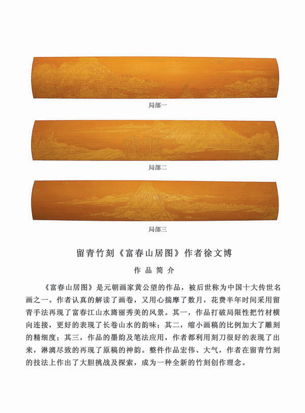 徐博(藝名文博),1973年生,江蘇武進(jìn)人,江蘇省省名人,高級工藝美術(shù)師,常州市留青竹刻非遺傳承人,常州工藝美術(shù)家協(xié)會理事,被譽為當(dāng)今中國最具創(chuàng)新意識的新銳竹刻家代表,多次獲得國家工藝美術(shù)大獎?釔哿羟嘀窨痰男煳牟┵p竹為樂,以竹詠志,借竹抒懷,悉心探索留青竹刻的藝術(shù)表現(xiàn)。在中國工藝美術(shù)大師蕭劍波的精心指導(dǎo)下,開創(chuàng)留青水墨山水之技法,更好的體現(xiàn)了竹刻淡雅清秀的藝術(shù)風(fēng)格,并不斷汲取書畫、攝影、雕塑等藝術(shù)精華,不斷滋養(yǎng)藝術(shù)情趣,提升擴(kuò)展胸襟人格的同時也逐步形成了其形神兼?zhèn)洌搶嵪嗌,氣韻生動的藝術(shù)特點,作品為眾多的國內(nèi)外收藏家珍藏。