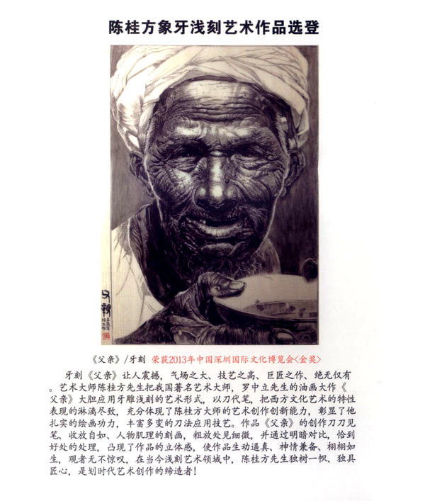 陳桂方,江蘇常州武進(jìn)人,中國著名雕刻藝術(shù)家,江蘇省工藝美術(shù)大師、研究員級、高級工藝美術(shù)師,江蘇省非物質(zhì)文化遺產(chǎn)《象牙淺刻》代表性傳承人。畢業(yè)于中國書畫函授大學(xué),深造于清華大學(xué)、南大美術(shù)系,現(xiàn)任中國工藝美術(shù)協(xié)會會員,江蘇省工藝美術(shù)學(xué)會理事,常州市工藝美術(shù)家協(xié)會副秘書長,常州市工藝美術(shù)行業(yè)協(xié)會常務(wù)理事,武進(jìn)工藝美術(shù)協(xié)會副主席。陳桂方大師淺刻作品的藝術(shù)特點(diǎn):山水氣韻生動,氣勢磅礴,場面壯觀,刀法細(xì)膩:人物仕女生動可人,栩栩如生,充分表達(dá)體現(xiàn)了中國象牙工藝獨(dú)具的內(nèi)在文化底蘊(yùn)和現(xiàn)代社會的審美觀念及獨(dú)特的淺刻藝術(shù)表現(xiàn)技藝。對每件藝術(shù)作品創(chuàng)作都精益求精,強(qiáng)調(diào)藝術(shù)創(chuàng)作的思想性、意境及內(nèi)涵。注重章法構(gòu)思,掌握牙刻藝術(shù)的特性表現(xiàn),作品具有鮮明生動的時代氣息,獨(dú)具所創(chuàng)工筆與寫意相結(jié)合的牙刻藝術(shù)表現(xiàn)手法和表現(xiàn)形式,出眾、飄逸、多變的刀法技藝,粗獷處見細(xì)微、方寸間見大觀的創(chuàng)作理念深受專家權(quán)威的肯定和業(yè)內(nèi)人士的一致好評。陳桂方大師至企頑事象牙淺刻藝術(shù)創(chuàng)作近四十余載,完善了自己的創(chuàng)作體系,成就了自己獨(dú)特的藝術(shù)風(fēng)格。作品數(shù)年來連續(xù)二十多次榮獲國家最高藝術(shù)精品大獎《金獎》,象牙淺刻作品《李逵探母》已被國家工藝美術(shù)館收藏,并頒發(fā)了國家收藏證書,在全國數(shù)十年間尚屬首次。當(dāng)前,陳桂方牙刻藝術(shù)作品已深受廣大海內(nèi)外業(yè)內(nèi)人士、收藏家們的鐘愛、青睞、熱藏,并被譽(yù)為當(dāng)代最杰出最具潛質(zhì)的實(shí)力派藝術(shù)大師。