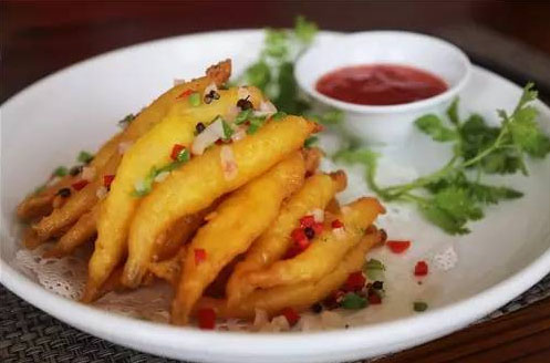 椒鹽大銀魚(yú) 從張總口中得知,原來(lái)太湖銀魚(yú)約有4種,眼前這道菜選用的就是個(gè)頭最大的銀魚(yú),也叫柴魚(yú)。只是簡(jiǎn)單地裹了面粉下鍋油炸,撒上點(diǎn)自配椒鹽料,酸甜汁作輔。盤(pán)中堆成“金色小山”看著美,聞著香,吃著鮮。區(qū)別于上一道菜,對(duì)這盤(pán)銀魚(yú)你大可放開(kāi)了吃,一口一個(gè),體驗(yàn)脆香表皮中肥美的滋味在口中迸發(fā),絕對(duì)是極致的享受。