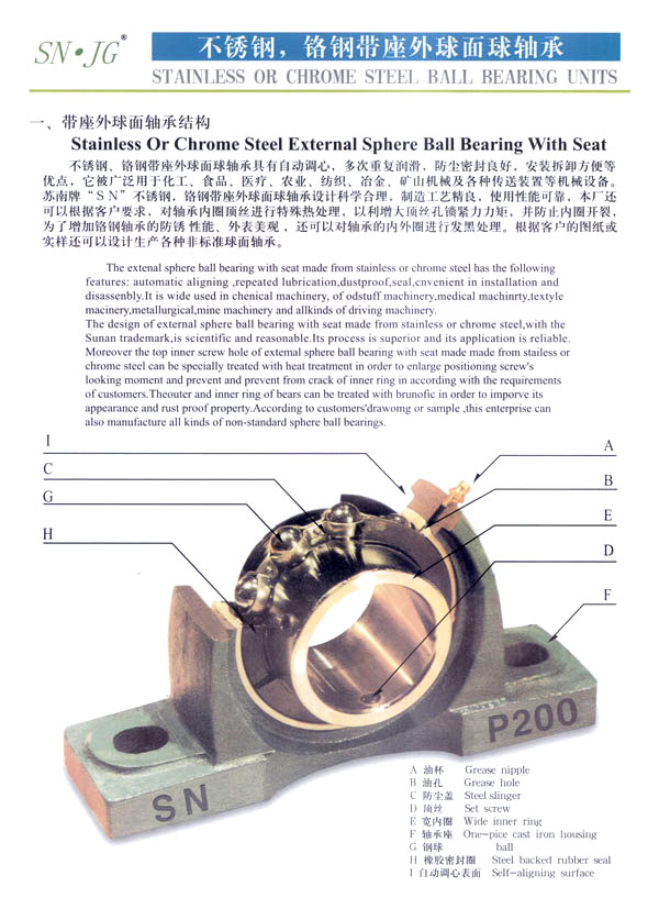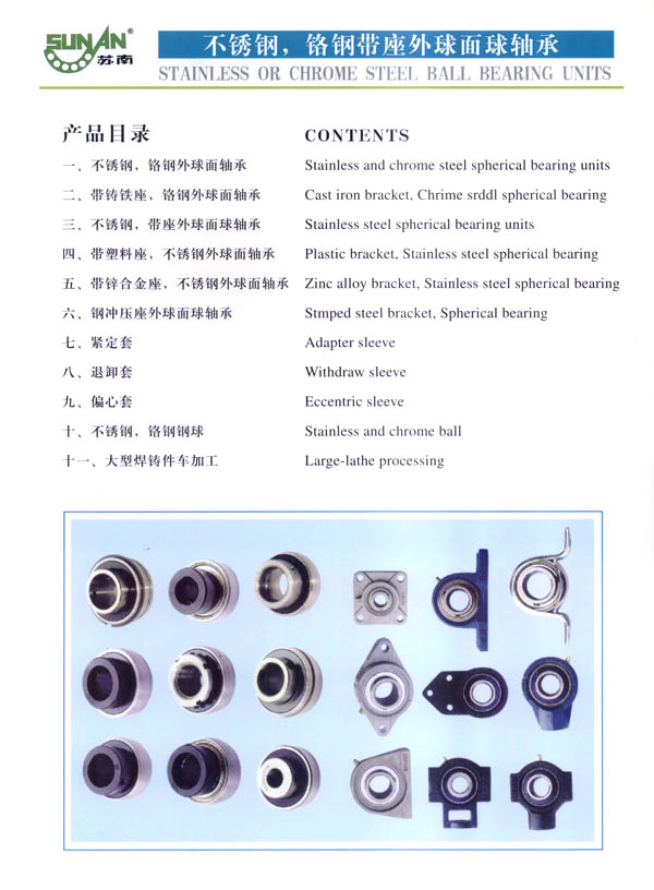 常州市武進(jìn)蘇南軸承有限公司是生產(chǎn)鋼球及帶座外球面軸承的專業(yè)工廠,主要生產(chǎn)蘇南牌“SN”不銹鋼球、鉻鋼鋼球,以及不銹鋼、鉻鋼UC、UCX、UK、HC、SB、SA、SER、UOOO、KOOO及其它非標(biāo)系列各類帶座外球面軸承、偏心套、緊定套等產(chǎn)品。本廠生產(chǎn)規(guī)格有軸承鋼球0.5-150m/m,碳鋼球0.5-150m/m,不銹鋼球0.8-50m/m,同時(shí)定做各種特殊規(guī)格的不銹鋼球、銅球、陶瓷球等。為廣大用戶提供品質(zhì)優(yōu)良,規(guī)格齊全,價(jià)格合理的各種鋼球。 本公司位于常州南部,錫宜高速公路串境而過(guò), 交通便利。南瀕風(fēng)景秀麗的太湖,沿湖丘陵地帶人文景觀豐富,為常州市武進(jìn)區(qū)太湖旅游度假區(qū) 。本廠環(huán)境優(yōu)美,具有良好的生產(chǎn)環(huán)境,我們竭誠(chéng)歡迎國(guó)內(nèi)外的朋友進(jìn)行廣泛多樣的經(jīng)濟(jì)合作交往和貿(mào)易合作,并為你提供優(yōu)良的服務(wù)。 本公司技術(shù)力量雄厚,工藝裝備先進(jìn),檢測(cè)手段完備,產(chǎn)品質(zhì)量穩(wěn)定,使用性能各項(xiàng)指標(biāo)都達(dá)到國(guó)際先進(jìn)水平,產(chǎn)品主要銷往美國(guó)、法國(guó)、德國(guó)、日本、意大利、澳大利亞、韓國(guó)、加拿大、及東南亞等國(guó)家和地區(qū)。本公司的“SN”商標(biāo)鋼球及帶座外球面軸承已贏得國(guó)內(nèi)外廣大用戶的信賴。 本公司具有外貿(mào)自營(yíng)出口權(quán),并于2002年9月通過(guò)ISO9001-2000版質(zhì)量體系認(rèn)證,于2004年8月通過(guò)“CQC”產(chǎn)品質(zhì)量認(rèn)證。