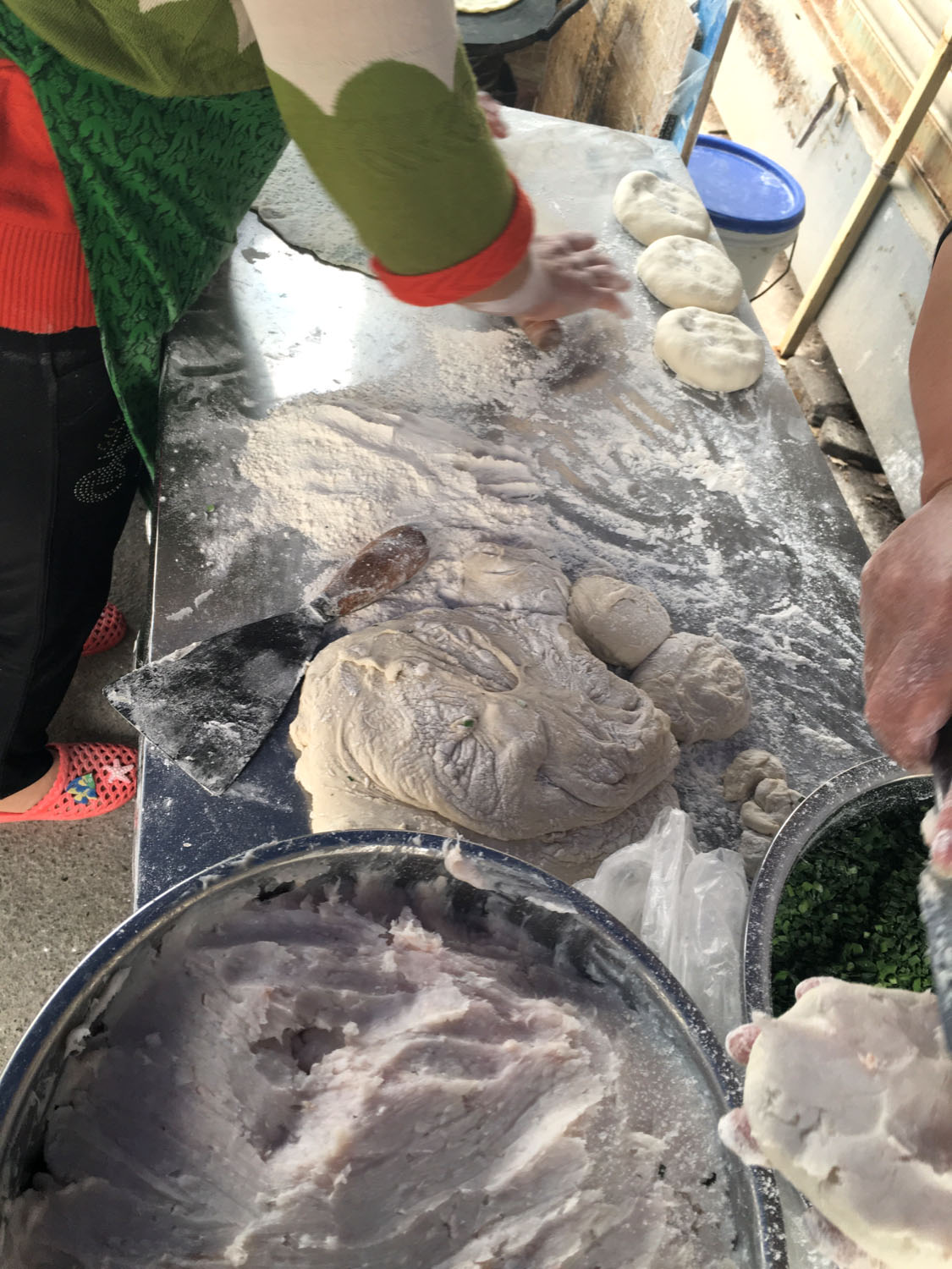 油酥餅(圖3-4)、糍團餅(圖5-6)、韭菜餅(圖7-8)   油酥餅每天晚上做,涼了更好吃,更酥更脆,里面都是很香的黑芝麻;糍團餅,每天中午擺攤熱了煎鍋開始煎,糯米做成,用菜籽油煎至金黃,餡兒是黑芝麻瓜子仁;韭菜餅是最受歡迎的,每天都有好多人排隊來買。供應時間:每年的4月份到11月份 下午1點到5點半。