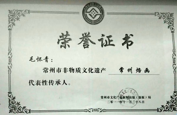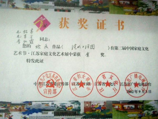 近年來,創(chuàng)作的烙畫作品分別獲得過全國、省市級的金、銀、銅獎多次。中央電視臺曾兩次播放過本人的烙畫作品,江蘇電視臺、常州電視臺也曾多次播放過本人的作品與烙畫藝術(shù)生涯,揚子晚報、常州日報、常州晚報也曾多次報導(dǎo)過本人的烙畫作品,出版物有三種版本都能查閱到介紹本的烙畫從藝生涯與藝術(shù)業(yè)績。