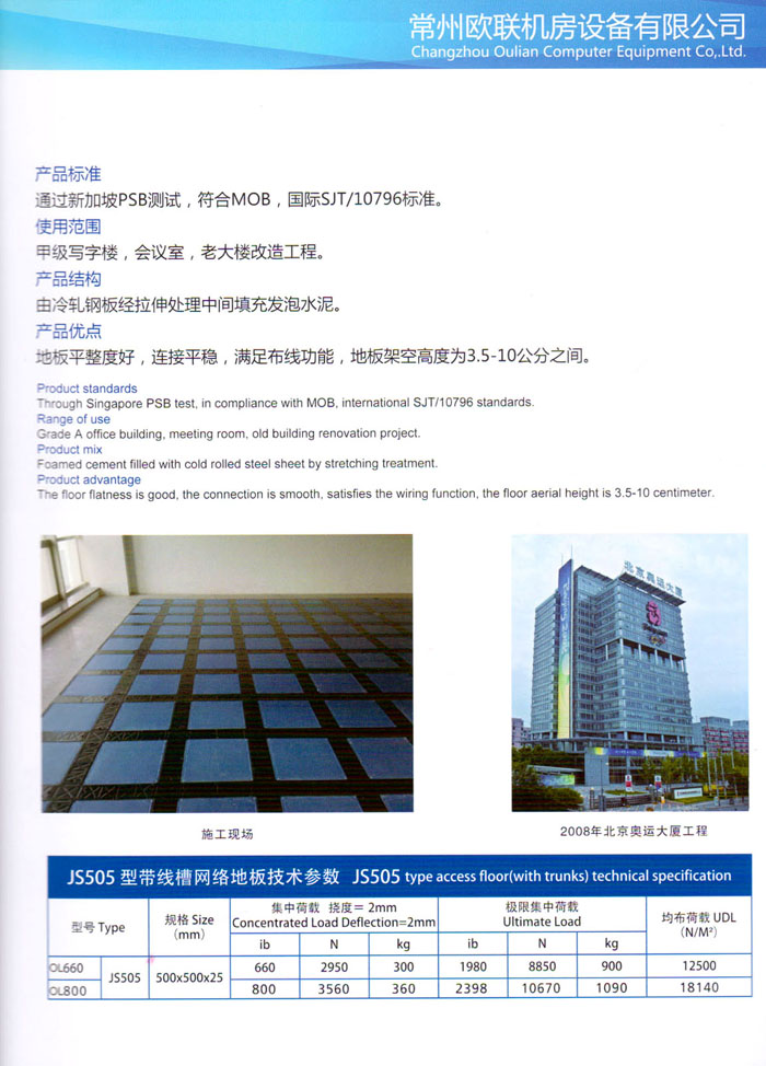 防靜電高架活動地板、全鋼地板、陶瓷地板是計算機(jī)行業(yè)發(fā)展起來的新型鋪地材料,隔離了潮氣、靜電灰塵,最重要的是解決了綜合布線問題,無需預(yù)埋管線,可隨時拆卸、搬移,保證了資訊設(shè)備完整的優(yōu)點(diǎn),適應(yīng)了智能化樓宇中信息自動化技術(shù)對所處環(huán)境的特定要求,避免了廣大客戶的雙重投資,使現(xiàn)代化辦公程度更加高效,辦公場所更加舒適。 “歐聯(lián)”系列全鋼地板,符合國家安全要求,種類完備多樣,其中防靜電陶瓷地板、硫酸鈣地板等除具有普通瓷質(zhì)的裝飾和實(shí)用性外,其耐磨、防水、防火功能優(yōu)于其它同類產(chǎn)品,防靜電系列地板,能切合不同客戶的要求,其靈活的配置,深受客戶歡迎,不同材質(zhì)的地板結(jié)構(gòu)使設(shè)計師的設(shè)計空間比傳統(tǒng)的更加廣闊自由和善變。 公司大力發(fā)展國內(nèi)外銷售業(yè)務(wù),多次中標(biāo)國內(nèi)重點(diǎn)工程 ,例:哈爾濱醫(yī)科大學(xué)、山東大學(xué)、上海普通機(jī)場等。 公司將一如既往開發(fā)和制造一流的產(chǎn)品,愿與廣大有識之士合作發(fā)展,共創(chuàng)美好未來。