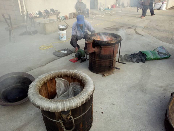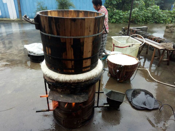 第一步:蒸糯米飯,老徐先用煤爐將水燒開,再將洗凈泡好的糯米放入一只大木桶中,放在爐子上蒸。除此以外,老徐還要不斷攪拌,保證糯米受熱均勻,直至散發(fā)出水蒸氣。為了保證米飯溫度,老徐特地用塑料薄膜將木桶封住,并用皮筋加固。蒸糯米飯,大約需要半個(gè)多小時(shí)。