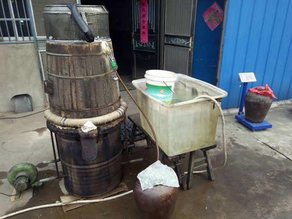 第四步:放入缸中,酒曲和糯米拌好后,便可放入屋內(nèi)的大缸中,并在其中挖出個(gè)圓形的洞,放入竹筒做酒窩。在此之前,大缸可用之前冷卻糯米飯的溫水擦一擦暖缸,這樣更有益于酒曲發(fā)酵。為了保證酒曲發(fā)酵的溫度,還要給酒料附上塑料薄膜。若是氣溫低于零度,還得多蓋上幾層棉被才行。像池阿姨家的400斤糯米,老徐至少要重復(fù)這些步驟八遍!大缸中的酒料大約發(fā)酵了10天左右,在酒乳已非常豐富之際,按照1:1的比例,打開封口加入冷開水,然后再蓋上棉被。繼續(xù)放置45天后,米酒才算大功告成!如果覺得米酒不過癮,老徐還會(huì)將米酒吊成燒酒,也就是白酒,依舊是傳統(tǒng)的老手藝。未來某天,TA會(huì)消失 ,其實(shí),做米酒的方法并不難,幾乎是以前家家戶戶的必備技能。然而現(xiàn)如今,不僅老常州們不再自己做酒,就連像老徐這樣的做米酒手藝人也越來越少。就連跟了老徐三十多年的一套米酒家當(dāng),也同樣經(jīng)不起歲月:鐵鍋漏了要去找橫山橋的老師傅;木桶壞了要去禮嘉修;爐子也有專門的式樣,過幾年就要拿著圖紙找人翻新......
