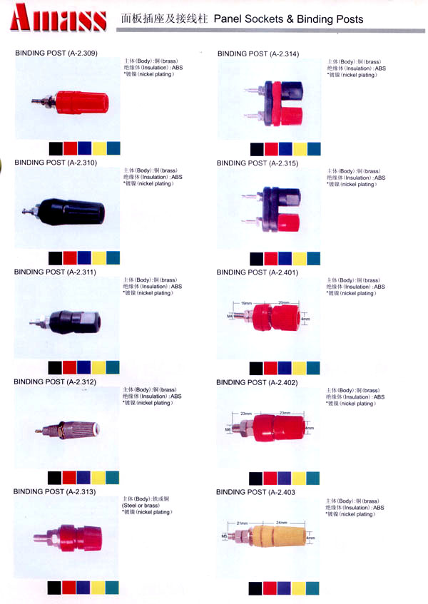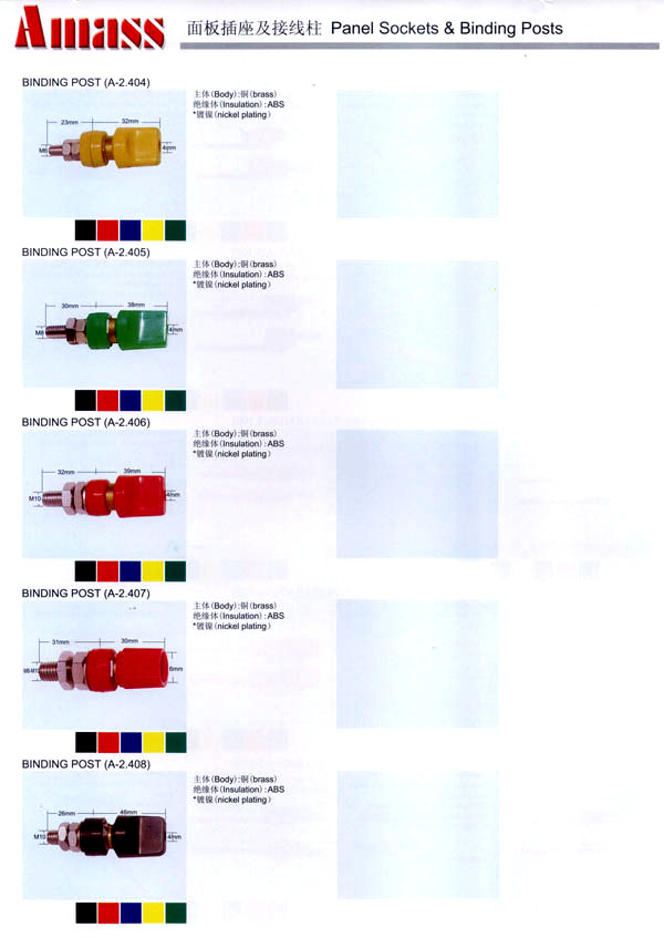 本公司專業(yè)生產(chǎn)各類香蕉插頭,香蕉插座,接線柱,電瓶夾,鱷魚夾,測試導(dǎo)線,測試筆等。產(chǎn)品分2mm/2.5mm/3mm/3.5mm/4mm五大系列,百余種款式, 各種香蕉插廣泛用于儀器、儀表、電力測試、教學(xué)、玩具,視聽設(shè)備、醫(yī)療儀器,保健產(chǎn)品等領(lǐng)域。公司技術(shù)力量雄厚,生產(chǎn)工藝先進,產(chǎn)品遠銷港、臺、歐美,并與飛利浦等國際品牌配套。公司本著精益求精的理念,歡迎新老客戶光臨。