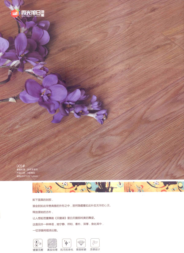 品牌保證,質量放心 公司旗下“霞光.旭日”品牌地板系列由旭日皇家、旭日經典、旭日戀家、至尊奢華、巧奪天工、水晶陶瓷等幾個系列構成,配有專職質量檢驗人員,嚴把產品質量關,不斷完善產品質量體系、監(jiān)控管理體系。公司對客戶需求全面、科學、準確地把握,確保對客戶市場適時高效反應。一流的設備、精心的選材、完美的工藝以及對產品品味不倦的追求,令奔公司產品獨樹一幟。