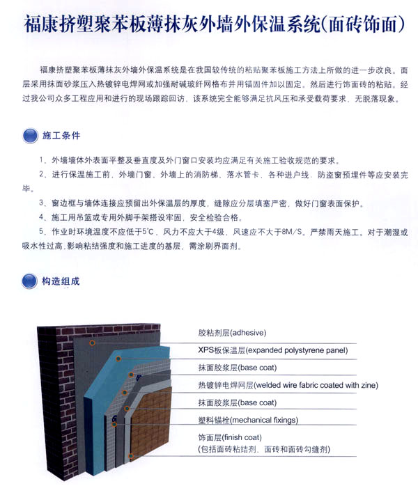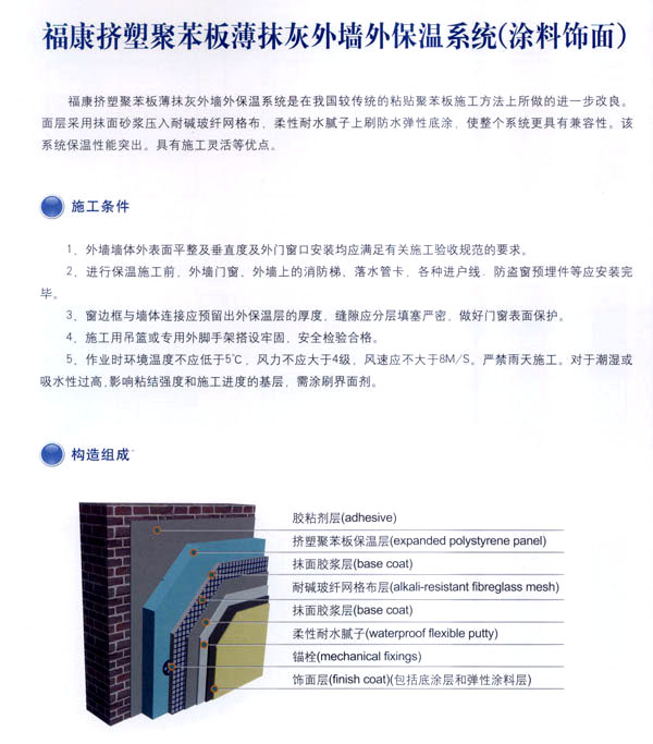 常州市福康新型建材有限公司是以研制開發(fā)、生產(chǎn)、銷售、施工、技術(shù)服務(wù)為一體的化學建筑材料的專業(yè)企業(yè),通過與歐洲著 名建筑材料公司和國內(nèi)權(quán)威科研機構(gòu)合作,并聘請國家級專家為技術(shù)顧問,開發(fā)出適合我國市場的福康EPS、XPS及聚苯顆粒外墻外保溫節(jié)能系統(tǒng)。 公司的生產(chǎn)線全部采用國內(nèi)先進的電腦控制自動化設(shè)備,配備了專業(yè)的實驗中心,并且采用進口的可再分散乳膠粉為基料,確保福康外墻外保溫節(jié)能系統(tǒng)具有性能優(yōu)異、安全可靠,綠色環(huán)保、適用性強的高品質(zhì)特點。 公司開發(fā)的\'?低鈮ν獗叵到y(tǒng)\'被列為江蘇省科技成果推廣項目。整個生產(chǎn)流程依照質(zhì)量體系的要求,實行嚴格的監(jiān)控和檢測,為生產(chǎn)優(yōu)質(zhì)產(chǎn)品提供保證。高品質(zhì)的?低鈮ν獗叵到y(tǒng),提供從熱工設(shè)計、產(chǎn)品開發(fā)、生產(chǎn)銷售及工程施工全程服務(wù)的一體化解決方案。 公司本著“綠色環(huán)保、節(jié)約能源、造福人類”的理念。用我們一流的產(chǎn)品和優(yōu)秀的服務(wù),打造出一個個節(jié)能康居示范工程,為人類營造出舒適健康的居住環(huán)境。我們愿為中國節(jié)能事業(yè)的發(fā)展積極努力,更上一層樓。 公司組建高效的生產(chǎn)經(jīng)營管理模式,設(shè)立專業(yè)技術(shù)服務(wù)機構(gòu)。配備售后的優(yōu)質(zhì)服務(wù)。實行原材料、運輸、安裝一條龍服務(wù)。經(jīng)本公司施工之后,貴公司可以直接批涂料、裝門窗、貼瓷磚,保證絕無任何質(zhì)量問題。