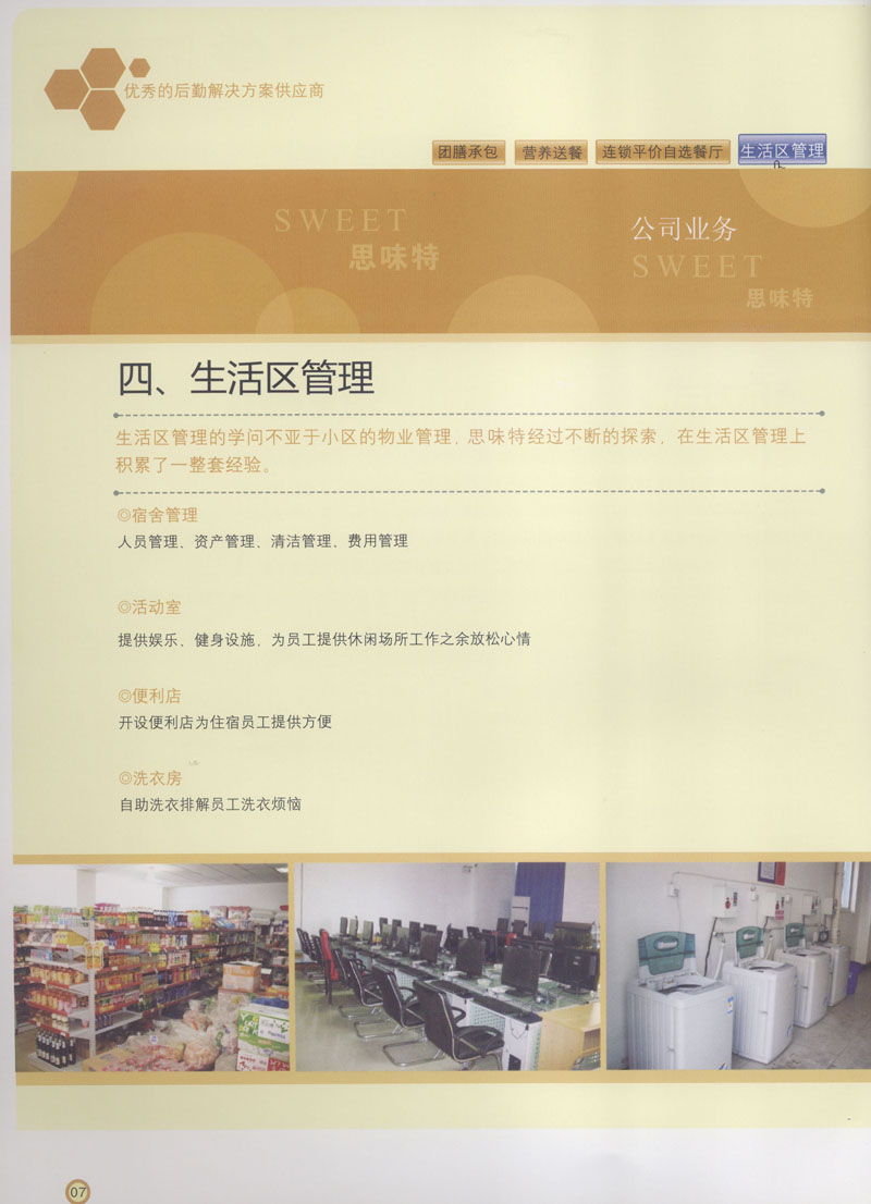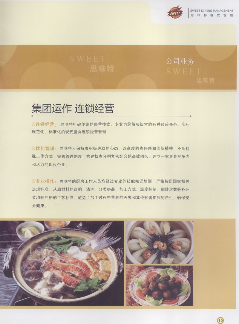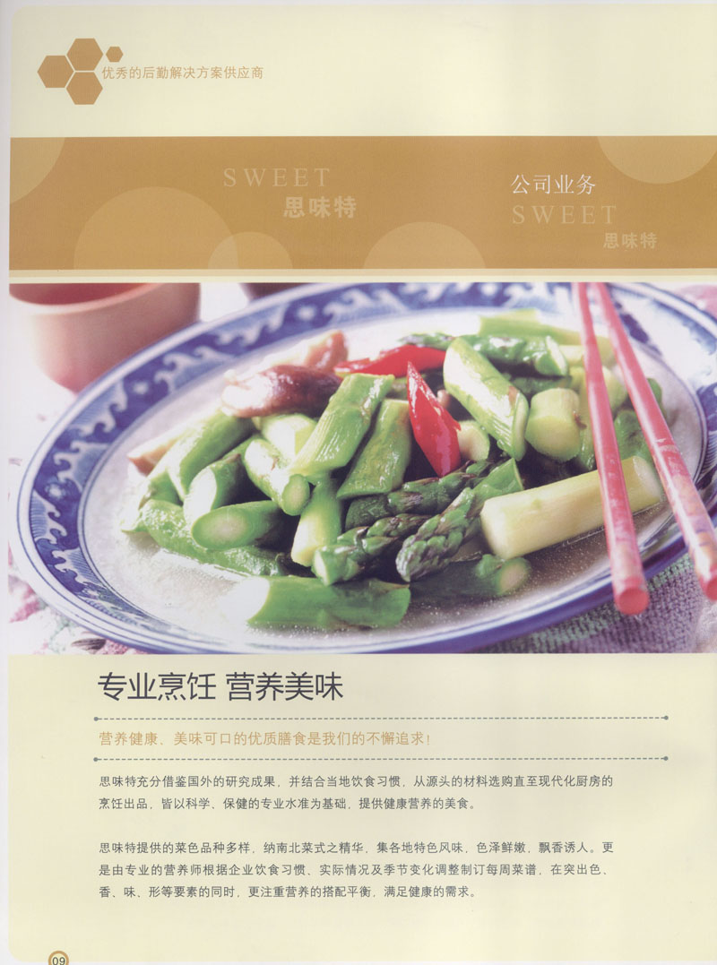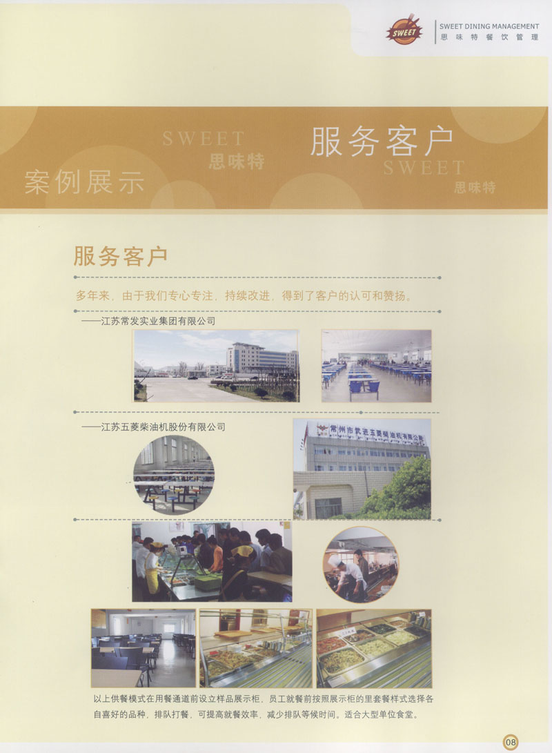 常州市思味特餐飲有限公司是一家專(zhuān)業(yè)從事企事業(yè)后勤服務(wù)的有限責(zé)任公司,公司從承包食堂起步,逐漸發(fā)展為經(jīng)營(yíng)團(tuán)膳承包、營(yíng)養(yǎng)送餐、生活區(qū)管理、連鎖餐廳的綜合型企業(yè)。2008年公司斥資100萬(wàn)元,在常州興建了可以同時(shí)提供3000餐膳食的中央廚房,重點(diǎn)打造“和美客”后勤服務(wù)品牌,全力為企事業(yè)單位解決后勤后顧之憂。 到目前為止,我們合作成功的企事業(yè)單位超過(guò)50多家,服務(wù)人數(shù)突破15萬(wàn),合作單位包括國(guó)家機(jī)關(guān)、國(guó)有企業(yè)、三資企業(yè)、民營(yíng)企業(yè)、學(xué)校、醫(yī)院等,其中不乏國(guó)際知名品牌公司。 和美客愿為更多的國(guó)內(nèi)外企事業(yè)單位及機(jī)關(guān)團(tuán)體分憂解難,從廚房設(shè)計(jì)、菜品配送、團(tuán)膳承包、到生活區(qū)管理等提供全方位的服務(wù)。