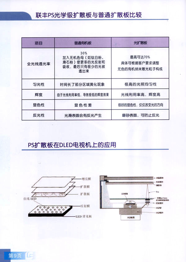 常州市聯(lián)豐(鏡面輥)集團(tuán)成立于2000年,是國(guó)內(nèi)從事板片材行業(yè)輥筒制造的專業(yè)企業(yè)。聯(lián)豐集團(tuán)全資子公司常州市聯(lián)豐光電科技有限公司成立于2013年6月。聯(lián)豐光電專業(yè)從事光學(xué)級(jí)擴(kuò)散板的研發(fā),生產(chǎn)和銷售。擁有各類高級(jí)技術(shù)研發(fā)人員10人,生產(chǎn)、管理及銷售人員60人。公司廠房占地面積2萬平方米,工廠擁有十萬級(jí)凈化車間,能有效滿足光學(xué)領(lǐng)域擴(kuò)散板生產(chǎn)的環(huán)境要求。公司已經(jīng)申報(bào)江蘇省高新技術(shù)企業(yè)。 公司現(xiàn)擁有全新進(jìn)口PS專用擴(kuò)散板材生產(chǎn)線兩條,月生產(chǎn)能力650噸PS擴(kuò)散板。日本進(jìn)口協(xié)榮裁切一體機(jī)兩臺(tái),月加工能力50萬片(32寸擴(kuò)散板)。 聯(lián)豐生產(chǎn)的VFP系列PS擴(kuò)散板能廣泛應(yīng)用于直下式LED,CCFL液晶電視背光模組。產(chǎn)品在很多國(guó)內(nèi)一線TV的背光模組上使用。產(chǎn)品具有高輝度,高擴(kuò)散性,特別適用于超薄背光模組的擴(kuò)散部件,能有效降低成本,節(jié)約能源。 由于LED照明行業(yè)的興起,公司特別針對(duì)于LED面板燈和筒燈開發(fā)的LFP系列擴(kuò)散板,在滿足透光率條件下,能最大限度提高光通量,從而增加燈具的光效,受到廣大客戶的好評(píng)。