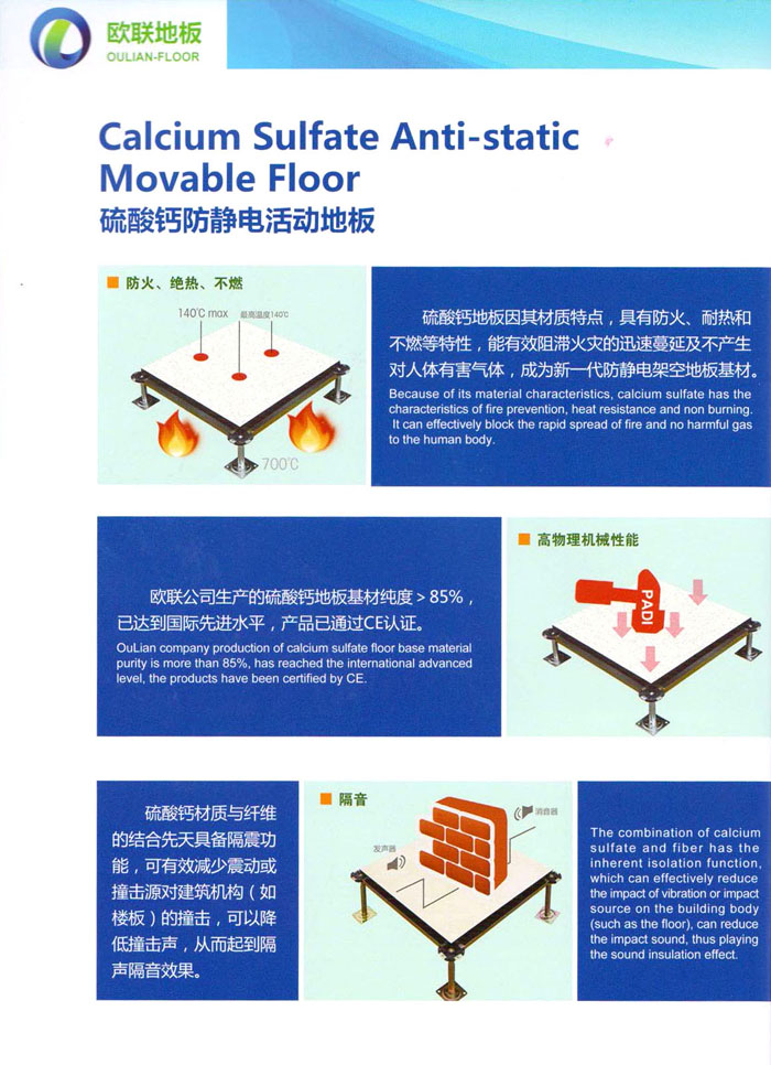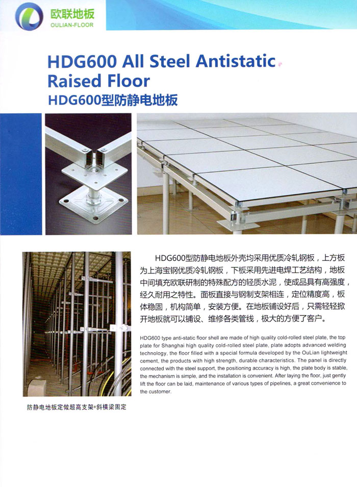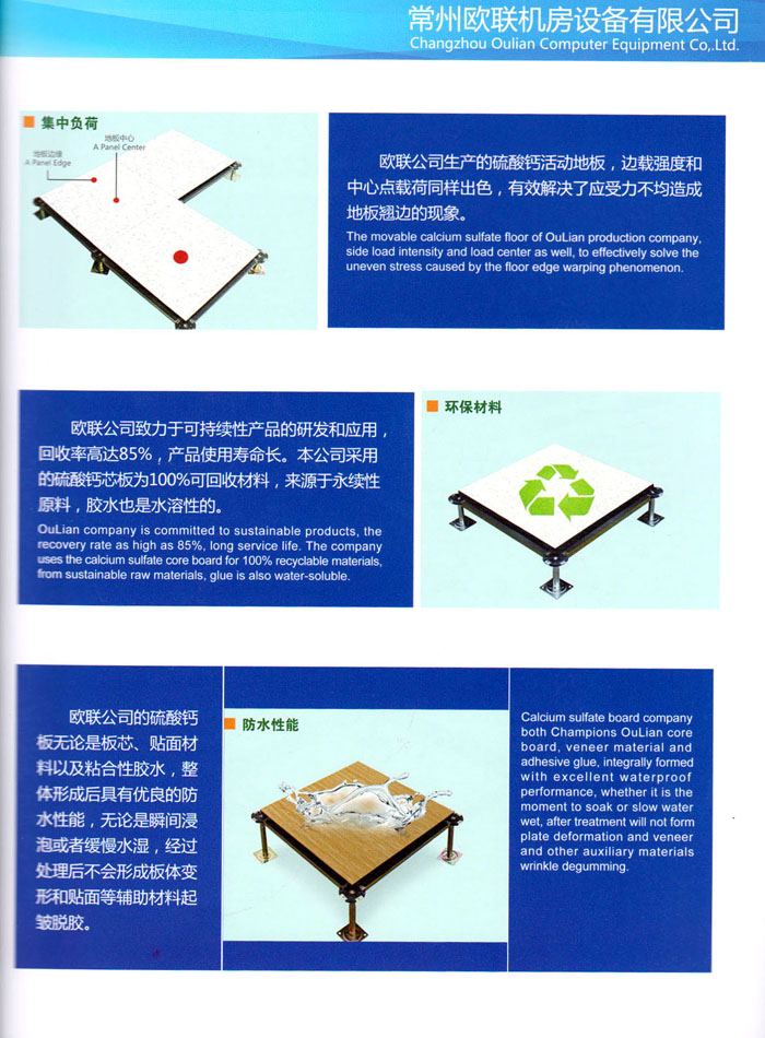 防靜電高架活動地板、全鋼地板、陶瓷地板是計算機行業(yè)發(fā)展起來的新型鋪地材料,隔離了潮氣、靜電灰塵,最重要的是解決了綜合布線問題,無需預(yù)埋管線,可隨時拆卸、搬移,保證了資訊設(shè)備完整的優(yōu)點,適應(yīng)了智能化樓宇中信息自動化技術(shù)對所處環(huán)境的特定要求,避免了廣大客戶的雙重投資,使現(xiàn)代化辦公程度更加高效,辦公場所更加舒適。 “歐聯(lián)”系列全鋼地板,符合國家安全要求,種類完備多樣,其中防靜電陶瓷地板、硫酸鈣地板等除具有普通瓷質(zhì)的裝飾和實用性外,其耐磨、防水、防火功能優(yōu)于其它同類產(chǎn)品,防靜電系列地板,能切合不同客戶的要求,其靈活的配置,深受客戶歡迎,不同材質(zhì)的地板結(jié)構(gòu)使設(shè)計師的設(shè)計空間比傳統(tǒng)的更加廣闊自由和善變。 公司大力發(fā)展國內(nèi)外銷售業(yè)務(wù),多次中標(biāo)國內(nèi)重點工程 ,例:哈爾濱醫(yī)科大學(xué)、山東大學(xué)、上海普通機場等。 公司將一如既往開發(fā)和制造一流的產(chǎn)品,愿與廣大有識之士合作發(fā)展,共創(chuàng)美好未來。