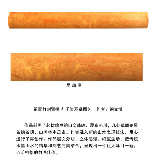 徐博(藝名文博),1973年生,江蘇武進(jìn)人,江蘇省省名人,高級(jí)工藝美術(shù)師,常州市留青竹刻非遺傳承人,常州工藝美術(shù)家協(xié)會(huì)理事,被譽(yù)為當(dāng)今中國(guó)最具創(chuàng)新意識(shí)的新銳竹刻家代表,多次獲得國(guó)家工藝美術(shù)大獎(jiǎng)?釔(ài)留青竹刻的徐文博賞竹為樂(lè),以竹詠志,借竹抒懷,悉心探索留青竹刻的藝術(shù)表現(xiàn)。在中國(guó)工藝美術(shù)大師蕭劍波的精心指導(dǎo)下,開(kāi)創(chuàng)留青水墨山水之技法,更好的體現(xiàn)了竹刻淡雅清秀的藝術(shù)風(fēng)格,并不斷汲取書畫、攝影、雕塑等藝術(shù)精華,不斷滋養(yǎng)藝術(shù)情趣,提升擴(kuò)展胸襟人格的同時(shí)也逐步形成了其形神兼?zhèn),虛?shí)相生,氣韻生動(dòng)的藝術(shù)特點(diǎn),作品為眾多的國(guó)內(nèi)外收藏家珍藏。