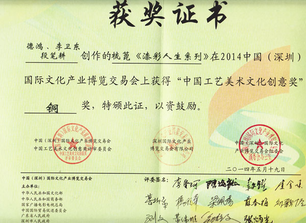 2014中國(guó)(深圳)國(guó)際文化產(chǎn)業(yè)博覽交易會(huì),徐德鴻、李衛(wèi)東、段筆耕《漆彩人生系列》獲得“中國(guó)工藝美術(shù)文化創(chuàng)意獎(jiǎng)”銅獎(jiǎng)