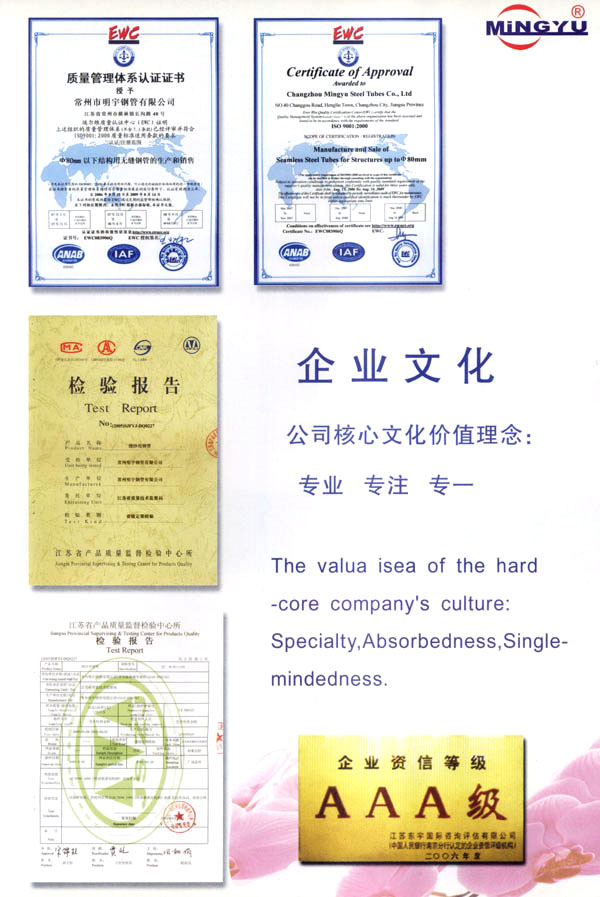 常州市明宇鋼管有限公司位于江南水鄉(xiāng)常州與無(wú)錫之間,緊臨滬寧高速,312國(guó)道,沿江高速,錫宜高速,京杭大運(yùn)河,交通極為方便。 公司創(chuàng)建于1992年,固定資產(chǎn)2500萬(wàn)元,車(chē)間面積15000平方米,現(xiàn)有職工220人,技術(shù)員30人,穿孔機(jī)組外徑40-80兩套,冷拔機(jī)組10T-80T八套,輥底式熱處理爐一套,形成年產(chǎn)30000噸各類無(wú)縫鋼管的生產(chǎn)能力。另有半自動(dòng)鋼鋸切割機(jī)八臺(tái),儀表倒角機(jī)18臺(tái),電鍍鋅槽3條,形成從切割、倒角、電鍍的鋼管深加工能力,年產(chǎn)紡機(jī)牽伸管、紗管、編織機(jī)筒管1000萬(wàn)支的生產(chǎn)能力。 集行業(yè)之精華,全新的設(shè)備,完備的檢測(cè)手段,嚴(yán)格的管理措施,良好的服務(wù)宗旨,高素質(zhì)的員工隊(duì)伍,在多年的生產(chǎn)實(shí)踐經(jīng)驗(yàn)基礎(chǔ)上,保障了出廠產(chǎn)品的質(zhì)量,以質(zhì)量求生存,以信譽(yù)求市場(chǎng),以科技求發(fā)展,以價(jià)格求客戶的經(jīng)營(yíng)理念,竭誠(chéng)為社會(huì)各界用戶提供一流服務(wù)。