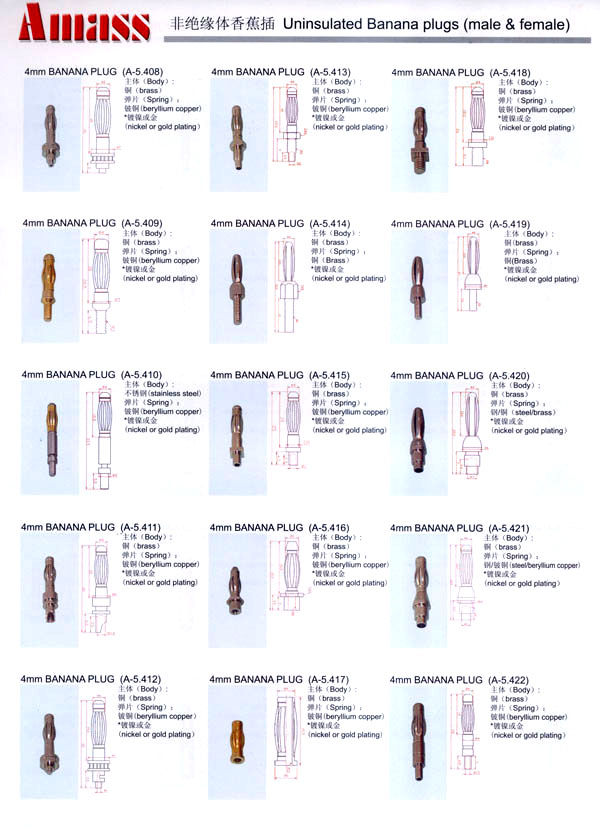 本公司專業(yè)生產(chǎn)各類香蕉插頭,香蕉插座,接線柱,電瓶夾,鱷魚夾,測試導(dǎo)線,測試筆等。產(chǎn)品分2mm/2.5mm/3mm/3.5mm/4mm五大系列,百余種款式, 各種香蕉插廣泛用于儀器、儀表、電力測試、教學(xué)、玩具,視聽設(shè)備、醫(yī)療儀器,保健產(chǎn)品等領(lǐng)域。公司技術(shù)力量雄厚,生產(chǎn)工藝先進(jìn),產(chǎn)品遠(yuǎn)銷港、臺(tái)、歐美,并與飛利浦等國際品牌配套。公司本著精益求精的理念,歡迎新老客戶光臨。 我們擁有資深的工程師和豐富的電子產(chǎn)品銷售經(jīng)驗(yàn),專業(yè)生產(chǎn)各類電子接插件產(chǎn)品。 香蕉插頭,香蕉插座,電瓶夾,鱷魚夾等品種齊全、 質(zhì)量可靠,致力服務(wù)于通訊、數(shù)據(jù)通信、消費(fèi)類電子產(chǎn)品、計(jì)算機(jī)和計(jì)算機(jī)外圍設(shè)備以及工業(yè)應(yīng)用等領(lǐng)域,能給客戶提供全面采購解決方案。 我們秉承穩(wěn)健作風(fēng)、誠實(shí)經(jīng)營、合理價(jià)格、完善服務(wù)的宗旨,在全體客戶的支持下,公司不斷創(chuàng)新進(jìn)取,業(yè)績蒸蒸日上,已與數(shù)十家電子零件制造商及其分支機(jī)構(gòu)建立密切合作關(guān)系,在國內(nèi)擁有數(shù)百家固定客戶。