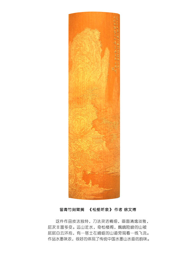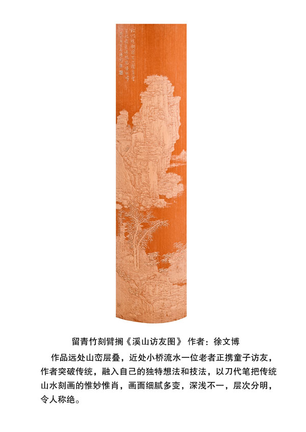 徐博(藝名文博),1973年生,江蘇武進人,江蘇省省名人,高級工藝美術師,常州市留青竹刻非遺傳承人,常州工藝美術家協(xié)會理事,被譽為當今中國最具創(chuàng)新意識的新銳竹刻家代表,多次獲得國家工藝美術大獎。酷愛留青竹刻的徐文博賞竹為樂,以竹詠志,借竹抒懷,悉心探索留青竹刻的藝術表現(xiàn)。在中國工藝美術大師蕭劍波的精心指導下,開創(chuàng)留青水墨山水之技法,更好的體現(xiàn)了竹刻淡雅清秀的藝術風格,并不斷汲取書畫、攝影、雕塑等藝術精華,不斷滋養(yǎng)藝術情趣,提升擴展胸襟人格的同時也逐步形成了其形神兼?zhèn),虛實相生,氣韻生動的藝術特點,作品為眾多的國內(nèi)外收藏家珍藏。