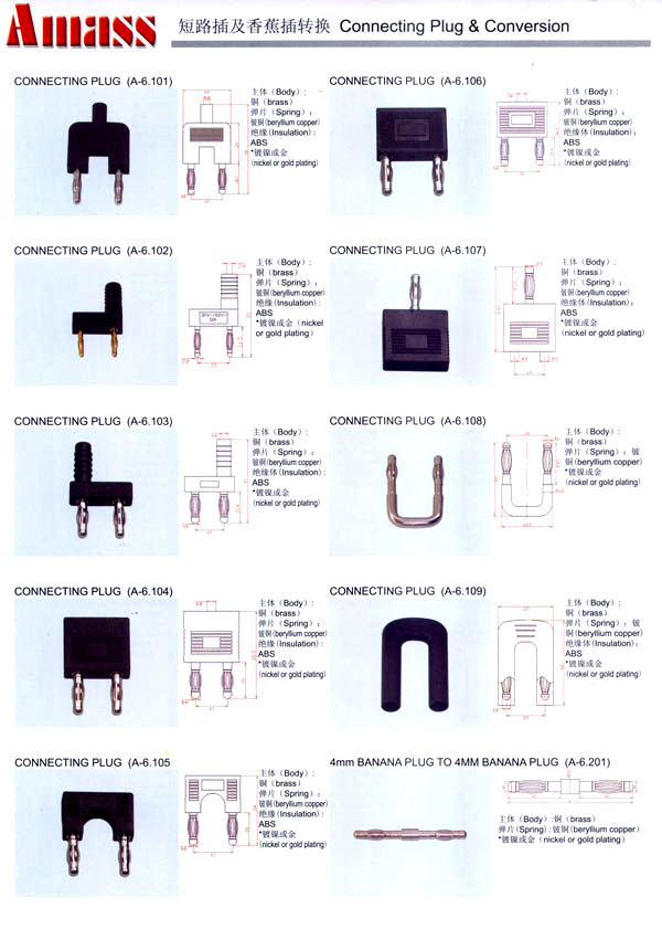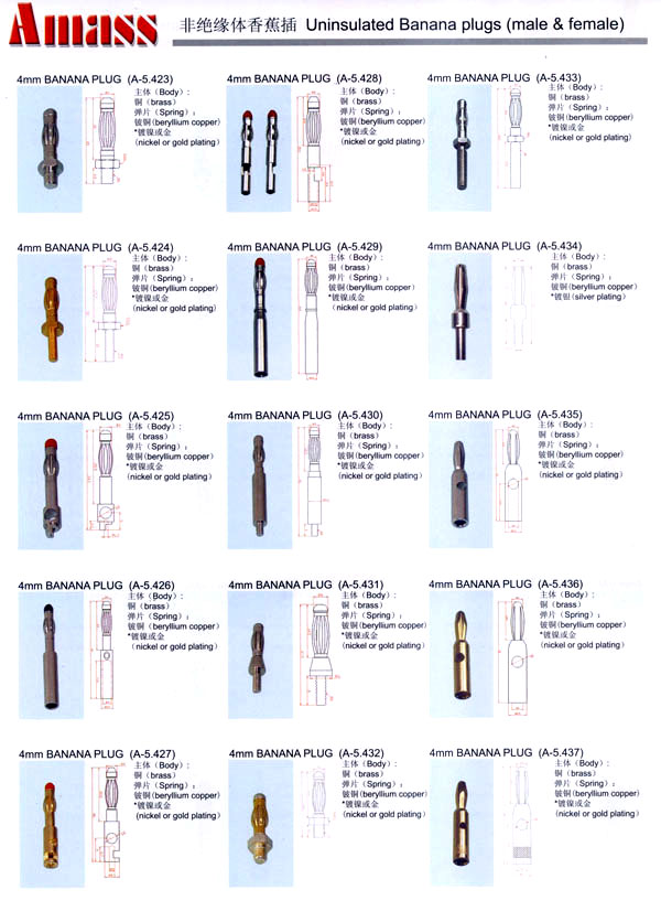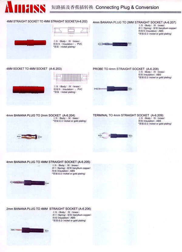 本公司專業(yè)生產(chǎn)各類香蕉插頭,香蕉插座,接線柱,電瓶夾,鱷魚夾,測試導(dǎo)線,測試筆等。產(chǎn)品分2mm/2.5mm/3mm/3.5mm/4mm五大系列,百余種款式, 各種香蕉插廣泛用于儀器、儀表、電力測試、教學(xué)、玩具,視聽設(shè)備、醫(yī)療儀器,保健產(chǎn)品等領(lǐng)域。公司技術(shù)力量雄厚,生產(chǎn)工藝先進,產(chǎn)品遠銷港、臺、歐美,并與飛利浦等國際品牌配套。公司本著精益求精的理念,歡迎新老客戶光臨。 我們擁有資深的工程師和豐富的電子產(chǎn)品銷售經(jīng)驗,專業(yè)生產(chǎn)各類電子接插件產(chǎn)品。 香蕉插頭,香蕉插座,電瓶夾,鱷魚夾等品種齊全、 質(zhì)量可靠,致力服務(wù)于通訊、數(shù)據(jù)通信、消費類電子產(chǎn)品、計算機和計算機外圍設(shè)備以及工業(yè)應(yīng)用等領(lǐng)域,能給客戶提供全面采購解決方案。 我們秉承穩(wěn)健作風(fēng)、誠實經(jīng)營、合理價格、完善服務(wù)的宗旨,在全體客戶的支持下,公司不斷創(chuàng)新進取,業(yè)績蒸蒸日上,已與數(shù)十家電子零件制造商及其分支機構(gòu)建立密切合作關(guān)系,在國內(nèi)擁有數(shù)百家固定客戶。