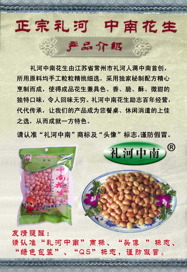 正宗的中南花生為綠色包裝,包裝上有“禮河中南”花生創(chuàng)始人蔣中南先生的頭像以及QS生產(chǎn)許可標(biāo)志,請(qǐng)廣大客戶認(rèn)準(zhǔn)購(gòu)買,以防假冒。
