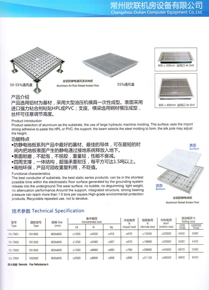 防靜電高架活動(dòng)地板、全鋼地板、陶瓷地板是計(jì)算機(jī)行業(yè)發(fā)展起來的新型鋪地材料,隔離了潮氣、靜電灰塵,最重要的是解決了綜合布線問題,無需預(yù)埋管線,可隨時(shí)拆卸、搬移,保證了資訊設(shè)備完整的優(yōu)點(diǎn),適應(yīng)了智能化樓宇中信息自動(dòng)化技術(shù)對(duì)所處環(huán)境的特定要求,避免了廣大客戶的雙重投資,使現(xiàn)代化辦公程度更加高效,辦公場(chǎng)所更加舒適。 “歐聯(lián)”系列全鋼地板,符合國(guó)家安全要求,種類完備多樣,其中防靜電陶瓷地板、硫酸鈣地板等除具有普通瓷質(zhì)的裝飾和實(shí)用性外,其耐磨、防水、防火功能優(yōu)于其它同類產(chǎn)品,防靜電系列地板,能切合不同客戶的要求,其靈活的配置,深受客戶歡迎,不同材質(zhì)的地板結(jié)構(gòu)使設(shè)計(jì)師的設(shè)計(jì)空間比傳統(tǒng)的更加廣闊自由和善變。 公司大力發(fā)展國(guó)內(nèi)外銷售業(yè)務(wù),多次中標(biāo)國(guó)內(nèi)重點(diǎn)工程 ,例:哈爾濱醫(yī)科大學(xué)、山東大學(xué)、上海普通機(jī)場(chǎng)等。 公司將一如既往開發(fā)和制造一流的產(chǎn)品,愿與廣大有識(shí)之士合作發(fā)展,共創(chuàng)美好未來。