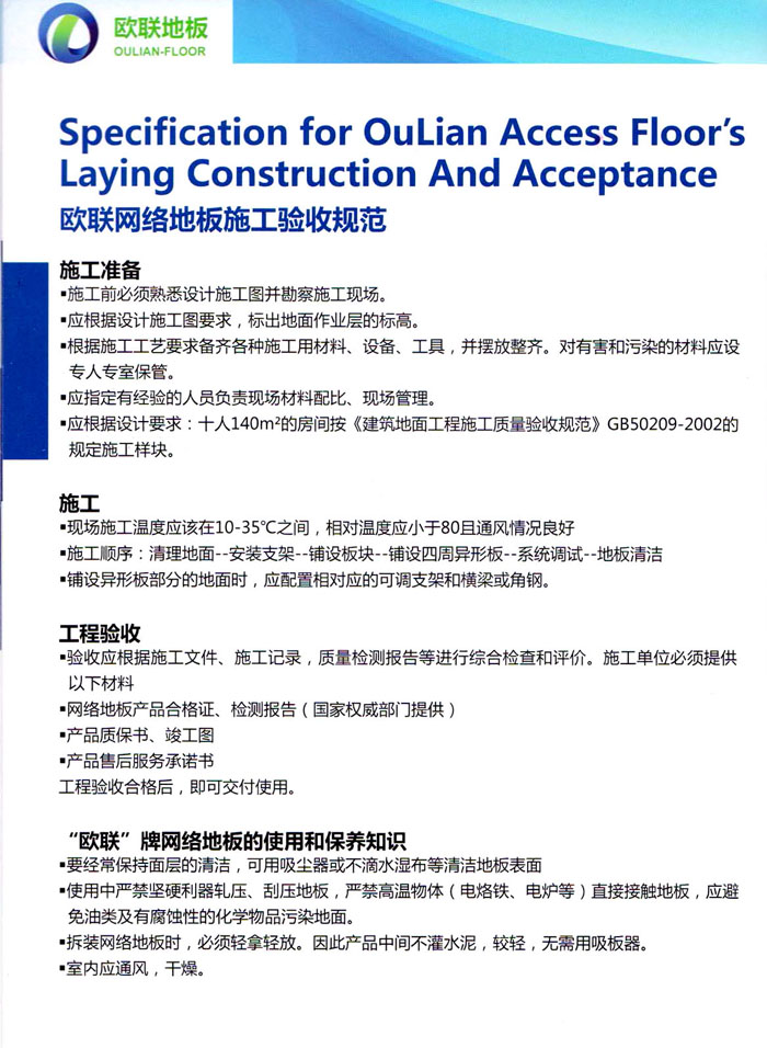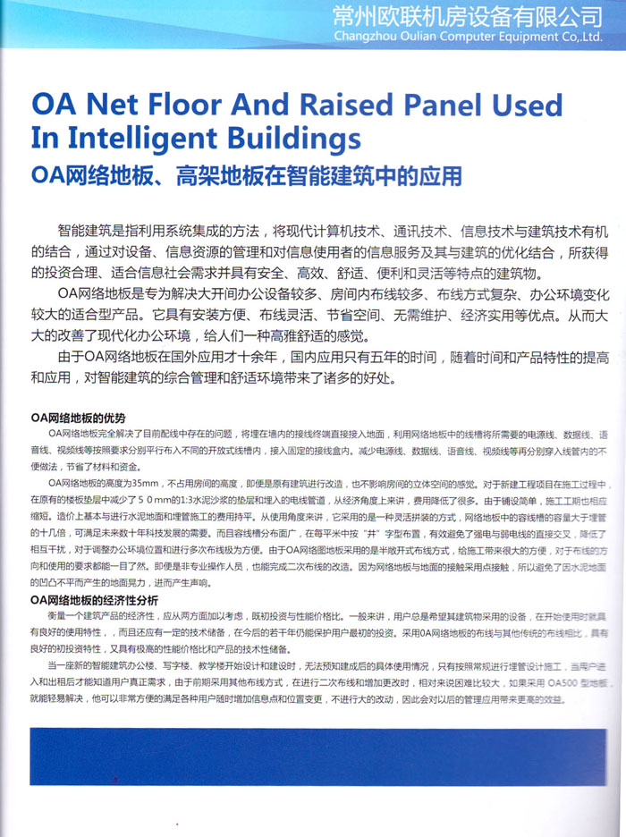 防靜電高架活動(dòng)地板、全鋼地板、陶瓷地板是計(jì)算機(jī)行業(yè)發(fā)展起來的新型鋪地材料,隔離了潮氣、靜電灰塵,最重要的是解決了綜合布線問題,無需預(yù)埋管線,可隨時(shí)拆卸、搬移,保證了資訊設(shè)備完整的優(yōu)點(diǎn),適應(yīng)了智能化樓宇中信息自動(dòng)化技術(shù)對所處環(huán)境的特定要求,避免了廣大客戶的雙重投資,使現(xiàn)代化辦公程度更加高效,辦公場所更加舒適。 “歐聯(lián)”系列全鋼地板,符合國家安全要求,種類完備多樣,其中防靜電陶瓷地板、硫酸鈣地板等除具有普通瓷質(zhì)的裝飾和實(shí)用性外,其耐磨、防水、防火功能優(yōu)于其它同類產(chǎn)品,防靜電系列地板,能切合不同客戶的要求,其靈活的配置,深受客戶歡迎,不同材質(zhì)的地板結(jié)構(gòu)使設(shè)計(jì)師的設(shè)計(jì)空間比傳統(tǒng)的更加廣闊自由和善變。 公司大力發(fā)展國內(nèi)外銷售業(yè)務(wù),多次中標(biāo)國內(nèi)重點(diǎn)工程 ,例:哈爾濱醫(yī)科大學(xué)、山東大學(xué)、上海普通機(jī)場等。 公司將一如既往開發(fā)和制造一流的產(chǎn)品,愿與廣大有識之士合作發(fā)展,共創(chuàng)美好未來。